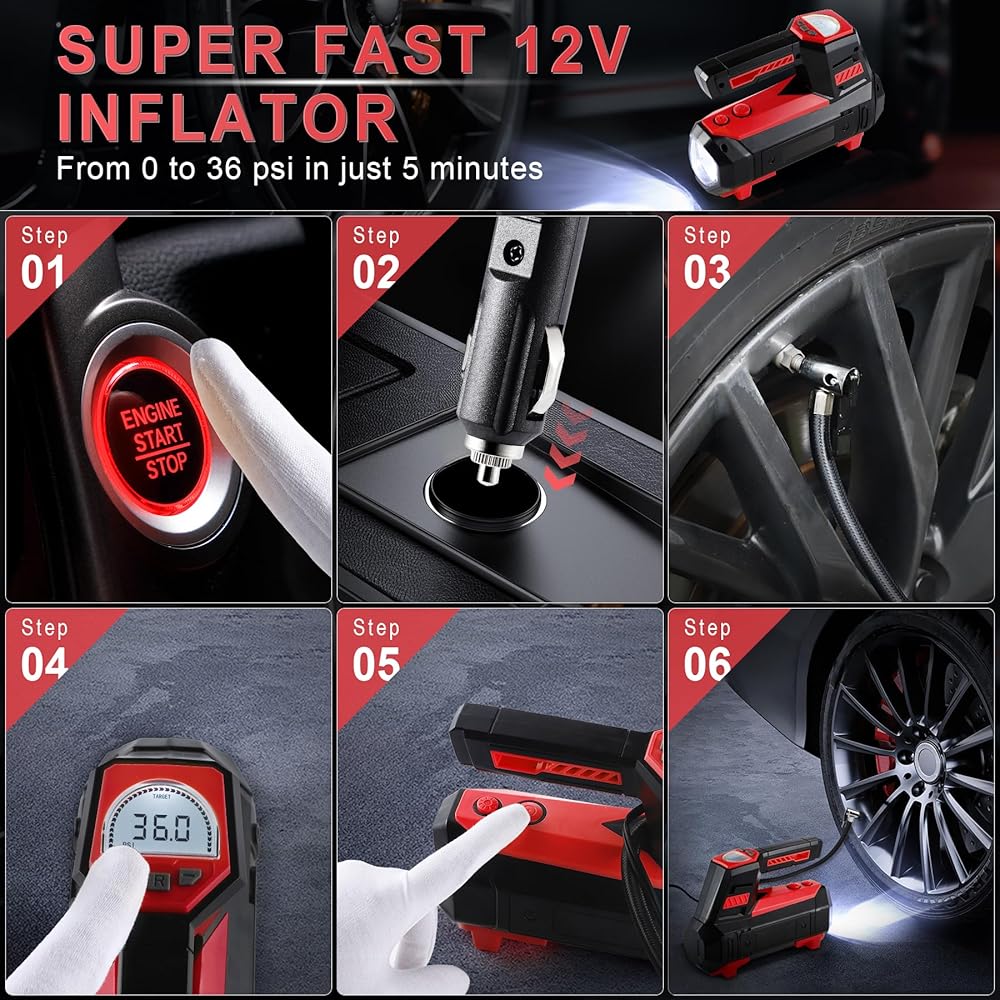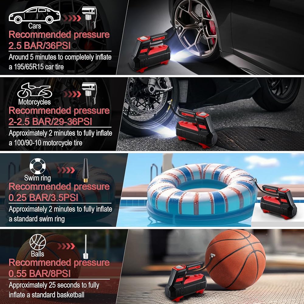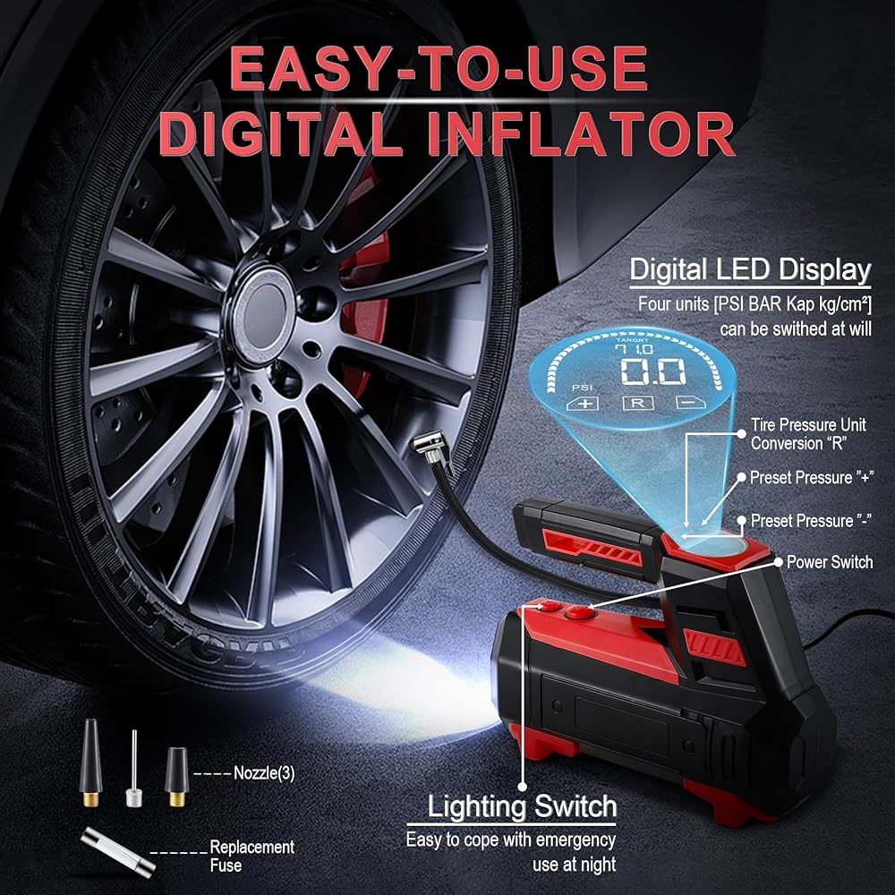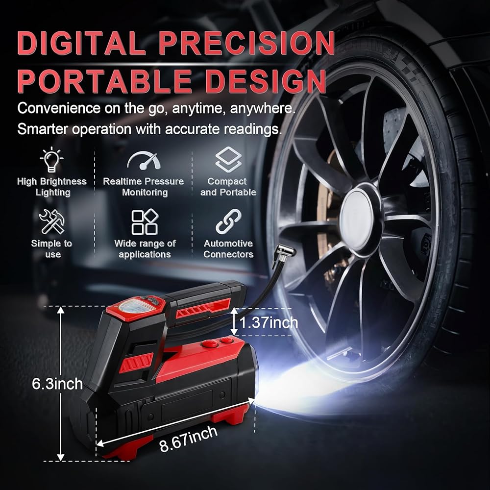 【AUTO Switch-off】This upgraded Car Air Compressor Pump uses latest technology. You can preset the pressure you need for the tire, and when the tire reaches the preprogrammed pressure, the car air pump will automatically turn off. So no more worries on over-inflating or low tire pressure anymore.