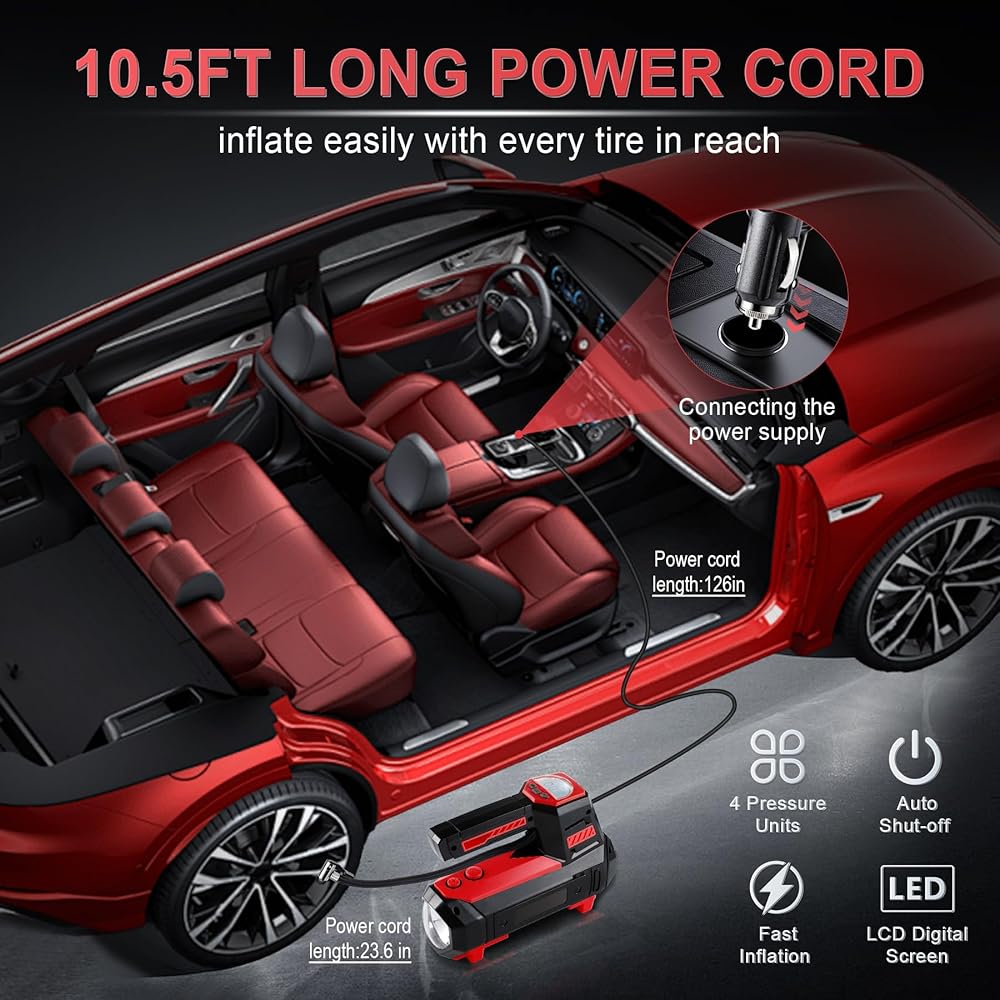 【More Functions】This electric auto air pump comes with the LED flasher and HD digital LCD display Screen for night uses. Besides, the 11 ft. power cable is long enough for you to reach the all the tires easily. No need to unplug it each time from one tire to another.