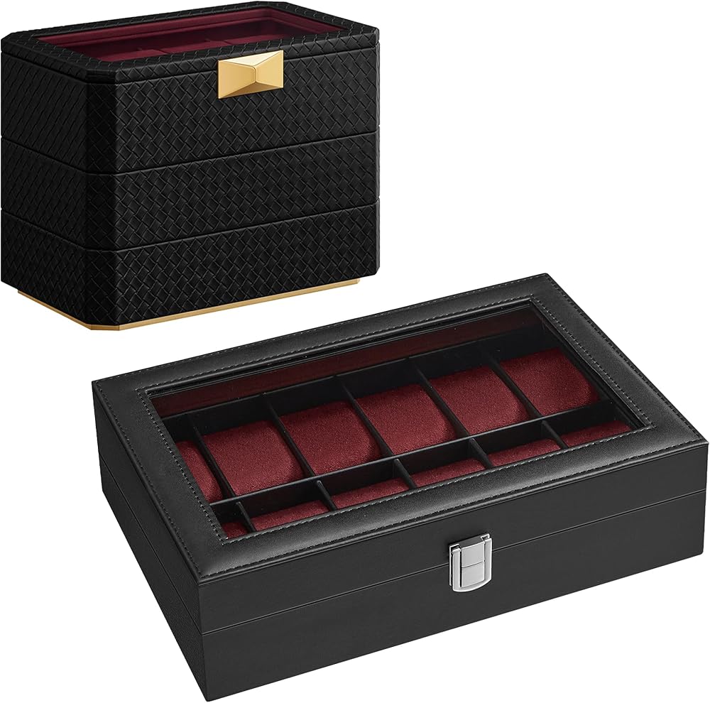 【تتضمن حزمة الحزمة】صندوق ساعة مكون من 12 فتحة مع غطاء زجاجي كبير ووسائد ساعة قابلة للإزالة، وحقيبة ساعة قابلة للتكديس مكونة من 8 فتحات تتميز بجلد البولي يوريثان المنسوج المنقوش. ستجد مجوهراتك وساعاتك الثمينة مكانًا لها ضمن حلول التخزين الأنيقة هذه