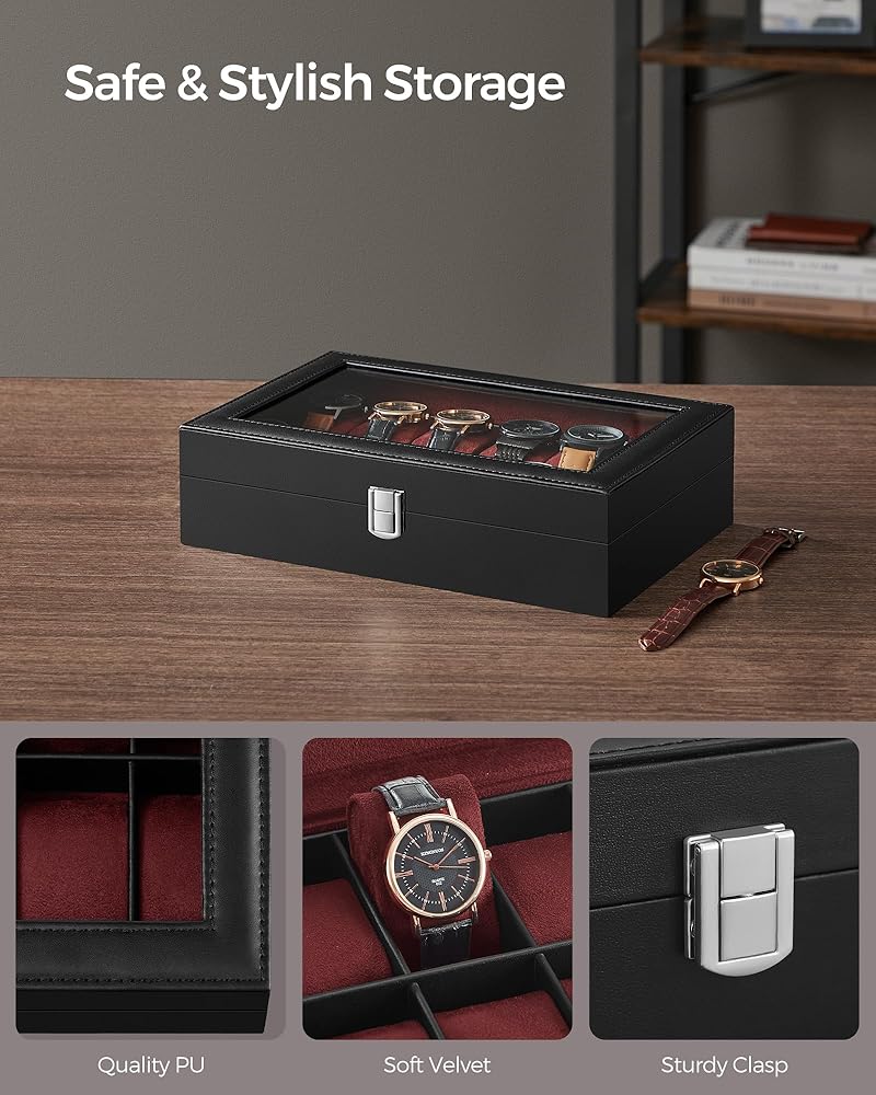 【صنعة ممتازة】صندوق الساعة مبطن بالقطيفة الناعمة لحماية ساعاتك المحبوبة من الخدوش، ومصنوع من مادة البولي يوريثان عالية الجودة لخدمة طويلة الأمد، ومجهز بمشبك معدني قوي لحماية أفضل.