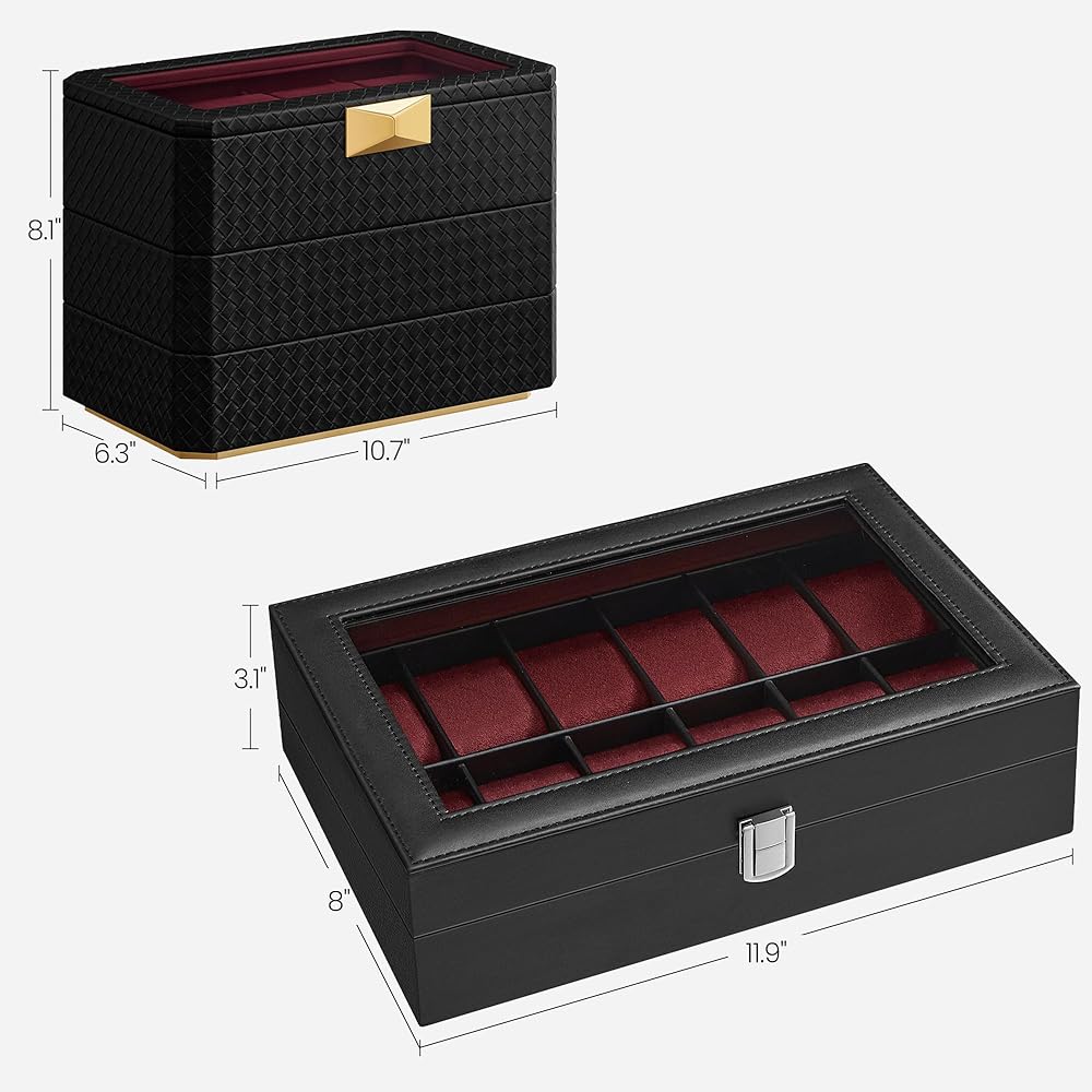 صندوق ساعة SONGMICS مكون من 12 فتحة وحزمة صندوق ساعة مكونة من 3 طبقات، علبة ساعة بغطاء زجاجي كبير، وسائد ساعة قابلة للإزالة، فكرة هدية، سطح أسود بالحبر، بطانة حمراء نبيذية UJWB120R01 وUJWB021R01