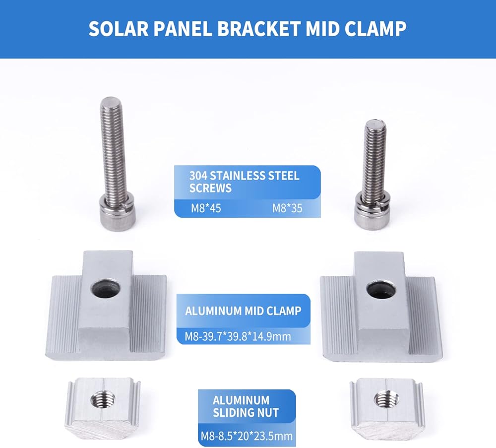 Package Included:4pcs solar panel clamps,2pcs M8x35mm hex socket head cap bolts screws,2pcs M8x45mm hex socket head cap bolts screws,4pcs spring washers and 4pcs slider nuts.