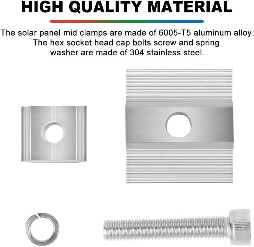 High Quality:The solar panel mid clamps are made of 6005-T5 aluminum alloy,anodized surface for corrosion resistance.The hex socket head cap bolts screw and spring washer are made of 304 stainless steel.