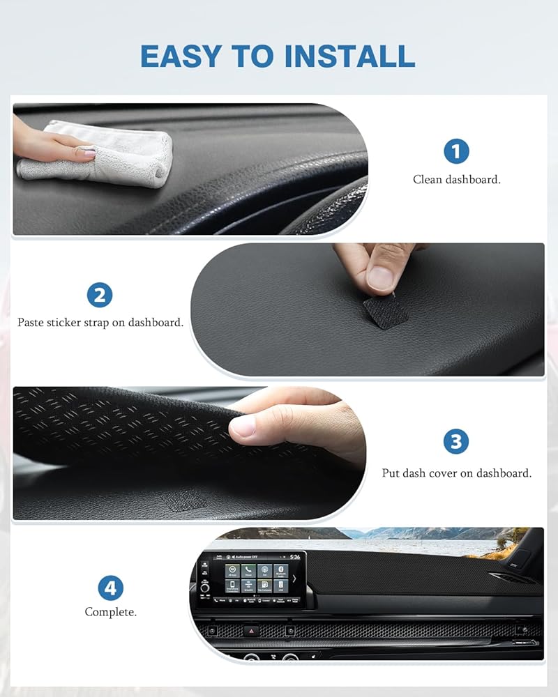 • قم بالتركيب في دقائق: نظف سطح لوحة أجهزة القياس الخاصة بسيارتك، ثم ضع غطاء لوحة أجهزة القياس على لوحة أجهزة القياس الخاصة بك. تأتي العبوة مع العديد من أشرطة الملصقات لمساعدتك على جعل غطاء لوحة القيادة أكثر ثباتًا. سهل التركيب والإزالة.