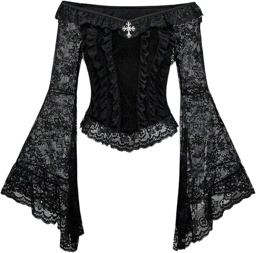 القوطية القوطية قبالة جرس الكتف الأكمام الطويلة تي القمصان الدانتيل لا تتكافس المحاصيل