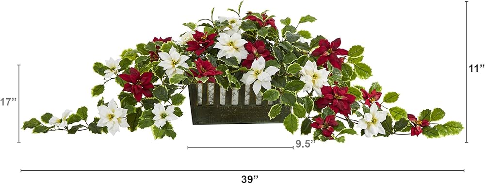 Showcase seasonal cheer all throughout the winter season with the help of this artificial plant boasting an extensive overgrowth of variegated holly leaves, delicately nestled throughout with silk poinsettia blossoms designed in a mix of seasonal hues with naturally occurring details - all of which feels real to the touch. Extending 39” wide from a decorative planter, this winter-inspired decorative plant is perfect for effortlessly showcasing holiday colors and textures all season long.