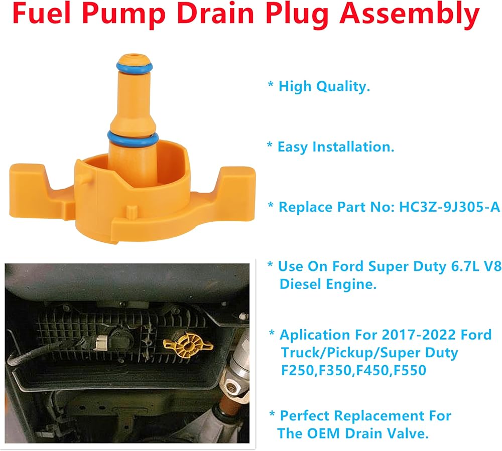 Fuel Pump Plug Assembly / Fuel Drain Valve Drain Plug Fit for Ford Truck/Pickup 2017-2022 F250, F350, F450, F550 Super Duty 6.7L V8 Diesel Engines. High Quality and Easy Installation.