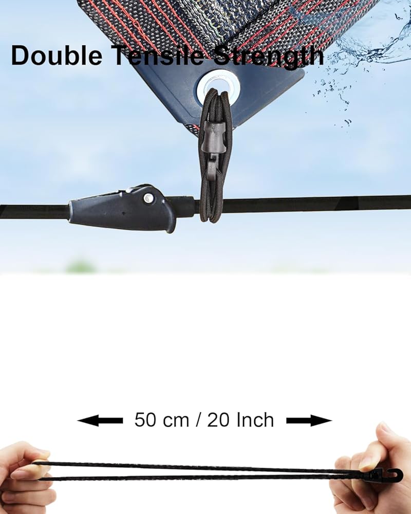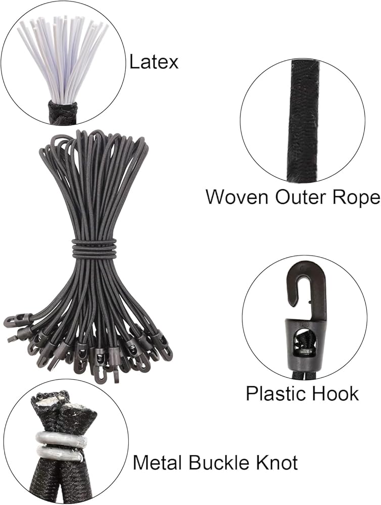 Bungee Cords with Hooks Features: The short bungee cords with hooks can holds the tent stably. The 10 Inch tarpaulin bungee cords can be stretched to 20 Inch. And the elastic bungee straps has a plastic hook which can be well fixed.