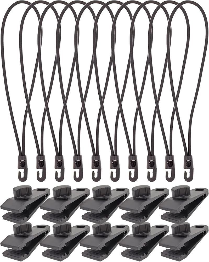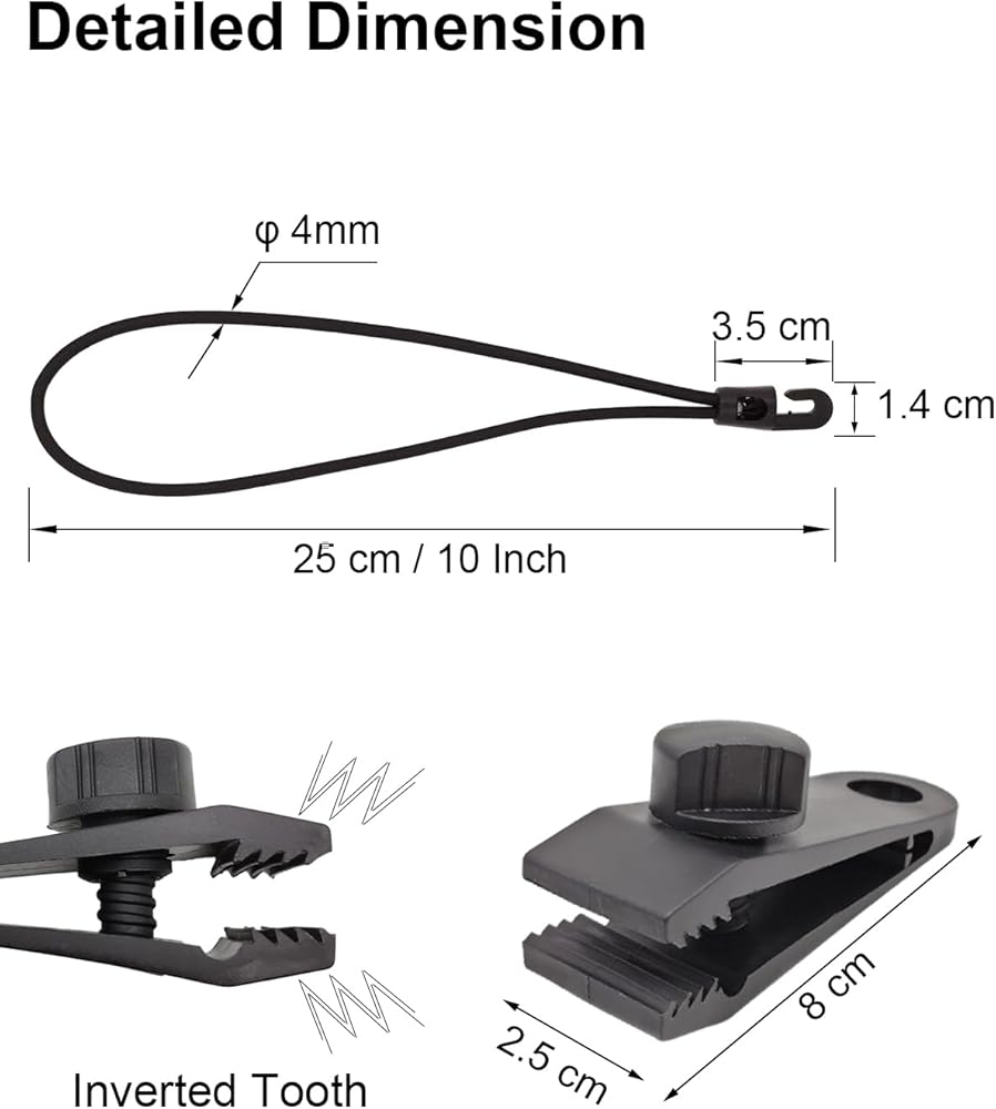 Camping Accessories Occasions: Ours tarp clips heavy duty and bungee cords with hooks are suitable for tarpaulins, camping, trucks, window curtains, boat shelters, marquees, garden, railing, caravanning, and commercial applications.