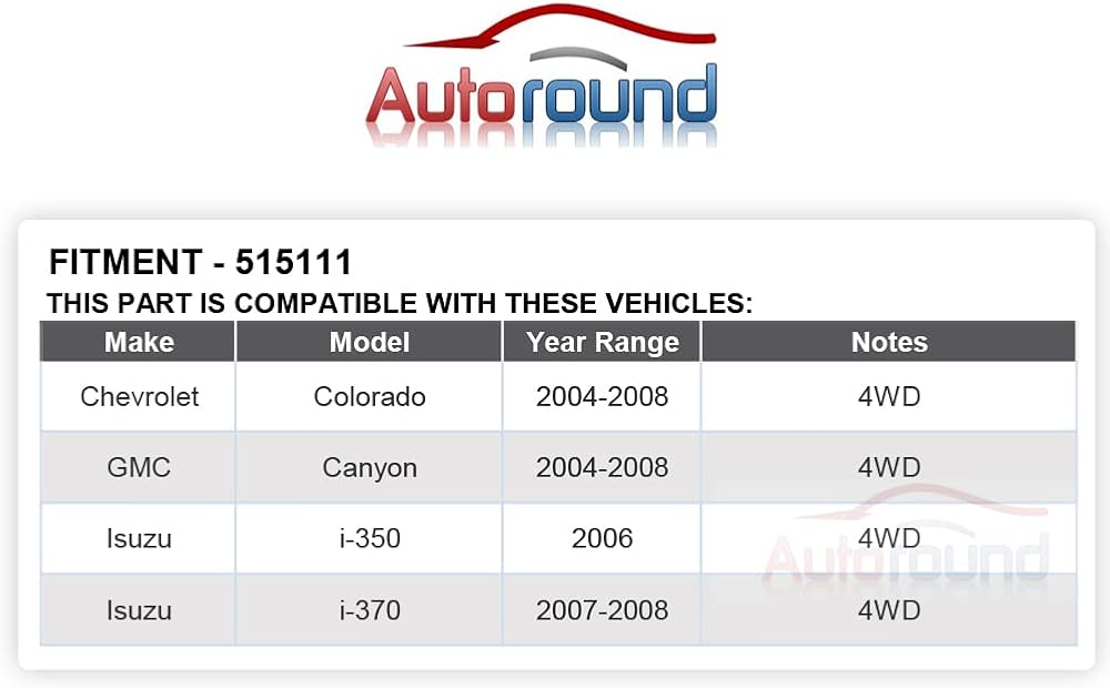 【مركبة الإعداد】- متوافقة مع سيارة شيفروليه كولورادو 2004-2008 (الأمام الأيمن؛ الدفع الرباعي)؛ 2004-2008 جي إم سي كانيون (أمامي يمين؛ دفع رباعي)؛ 2006 إيسوزو i-350 (أمامي يمين، دفع رباعي)، 2007-2008 إيسوزو i-370 (أمامي يمين، دفع رباعي)