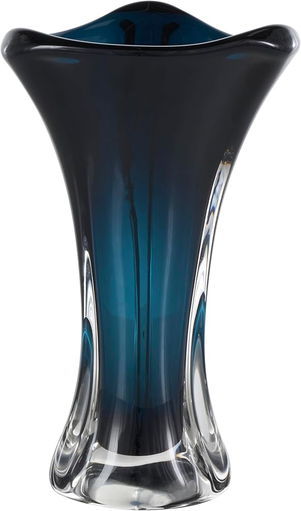 Use this tulip vase as a centerpiece in any console table, adding a pop of color to your space. Designed with felt or rubber stoppers at the base that prevent scratching furniture and table tops, as well as sliding around. This item ships in 1 carton. Glass vase makes a great gift for any occasion. Suitable for indoor use only. This item ships fully assembled in one piece. This is a single dark blue colored vase. Contemporary style. Vase has a 4 in mouth opening.