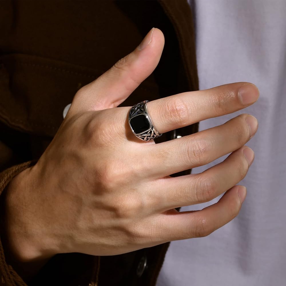 • خاتم العقيق بعقدة سلتيك للرجال: هذا النوع من خاتم الإصبع الكلاسيكي للرجال مصنوع من نمط العقدة السلتية والعقيق الأسود، العقدة السلتية ترمز إلى الدوام والاتصال والإيمان السلتي باستمرارية الحياة. العقيق الأسود هو حجر يمنح القوة، فهو يساعد على الثقة ويحسن التركيز. تُظهر جميعها سحرك الشخصي وذوقك وإيمانك بالثقافة السلتية.