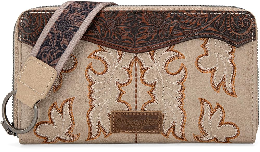 • Wrangler crossbody bag, features a stylish floral tooled pattern, genuine leather fringing and embroidered boot stitching.