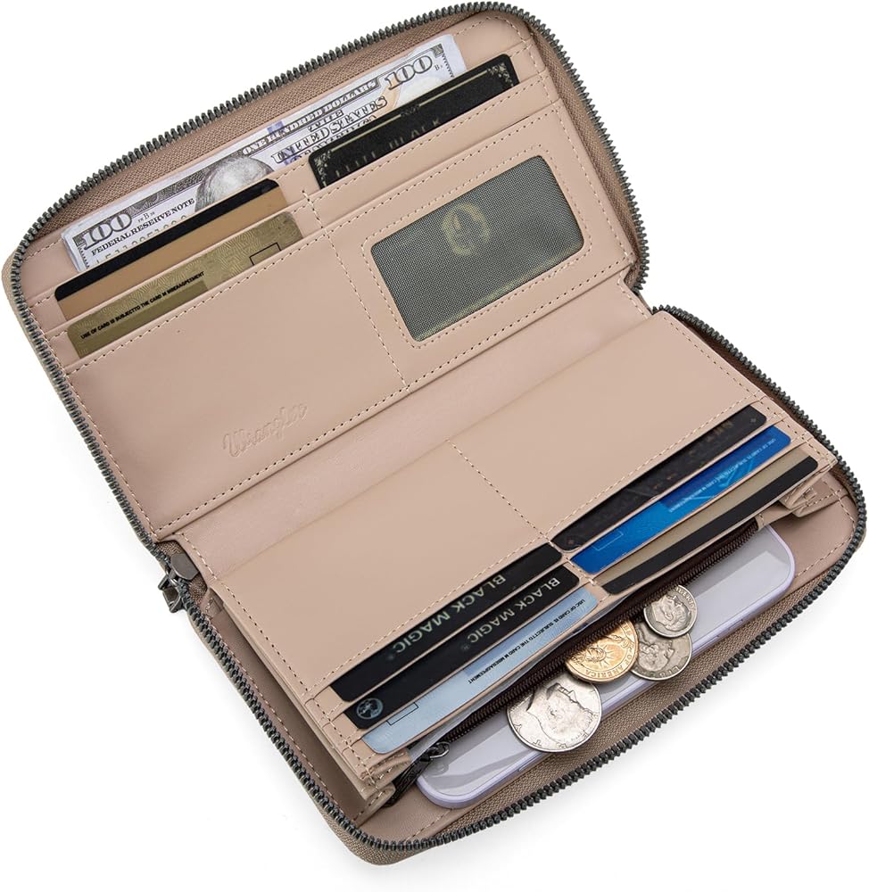 • Top zipper closure, interior credit card slots, bill pockets, 1 zip coin pocket, phone compartment.