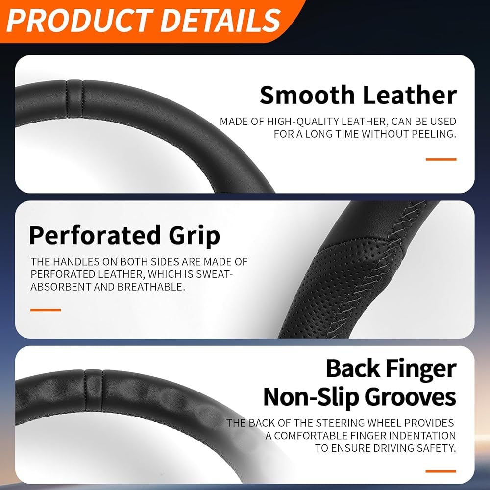 تصميم فريد: توجد أخاديد خلفية غير قابلة للانزلاق خلف عجلة القيادة، والتي يمكن أن تزيد من احتكاك الأصابع لمنع عجلة القيادة من الانزلاق. المقبض مصنوع من جلد مثقوب، مقاوم للاهتراء وصديق للبشرة، مما يمنحك تجربة قيادة أفضل. يتم خياطة الخيط يدويًا على يد خبراء، مما يضيف لمسة فريدة من نوعها إلى الجزء الداخلي من السيارة