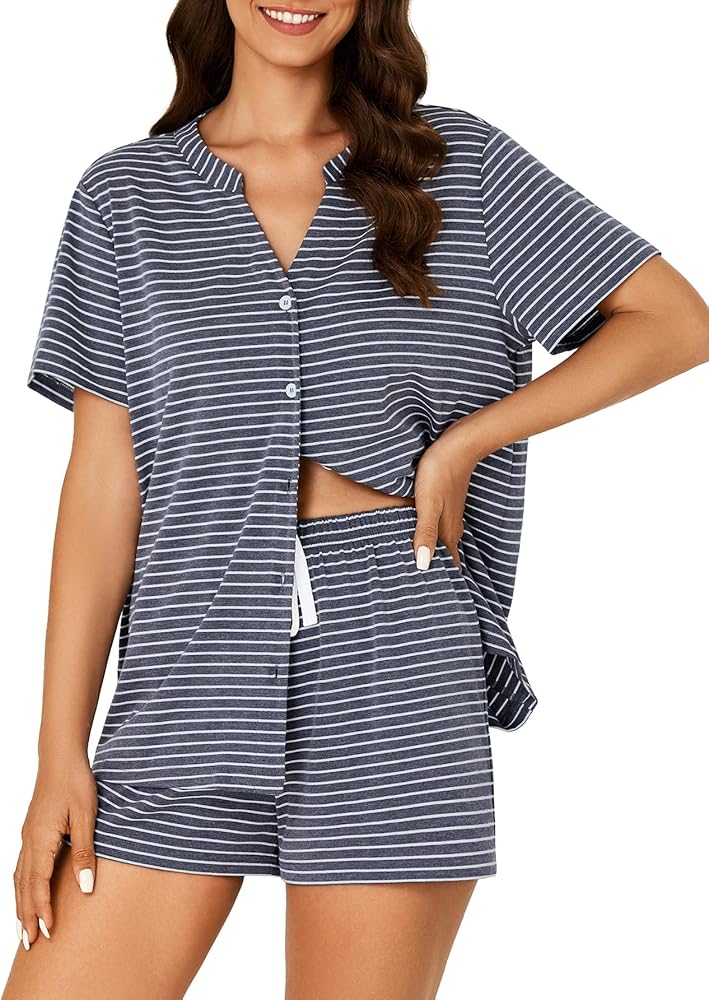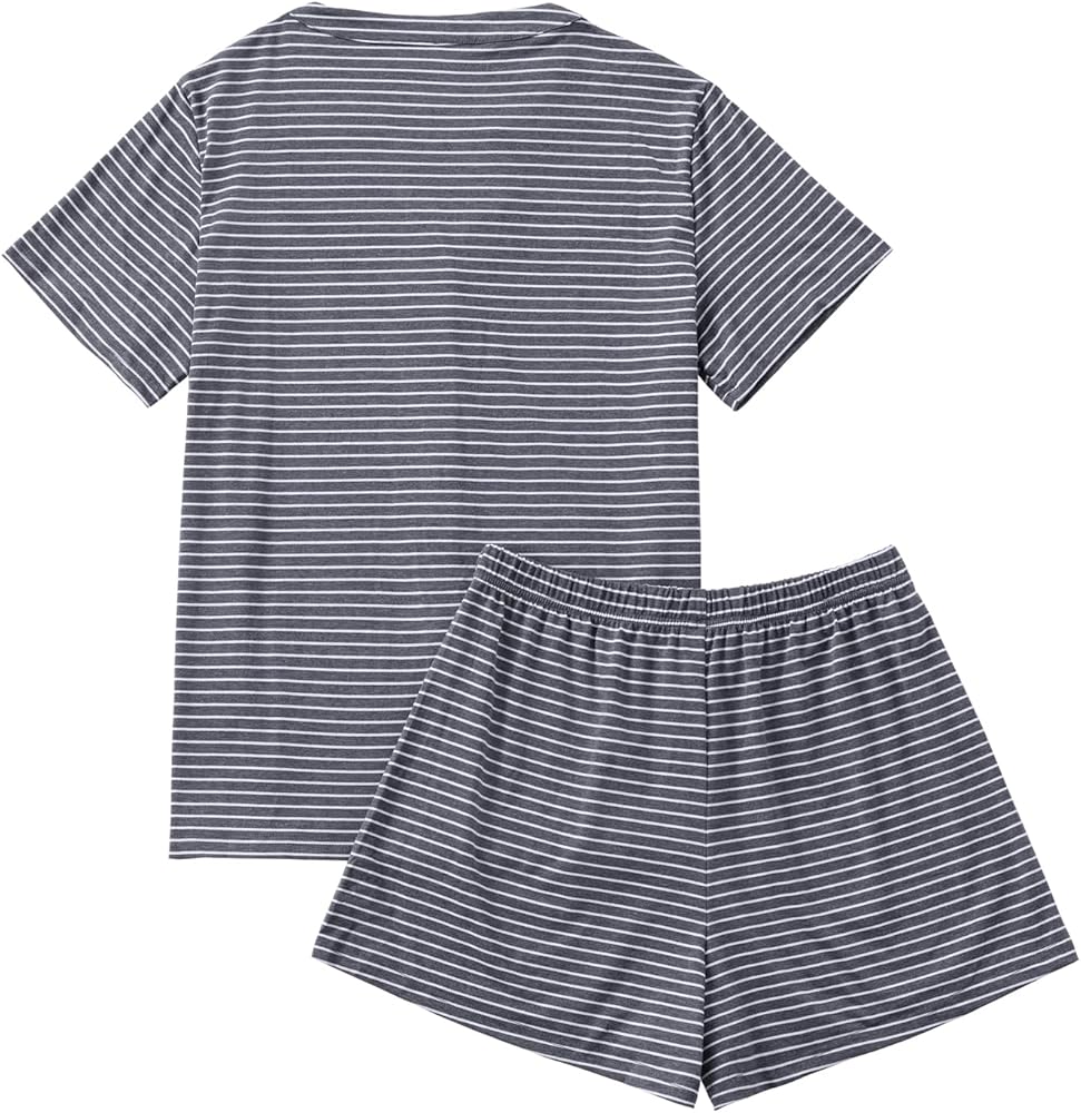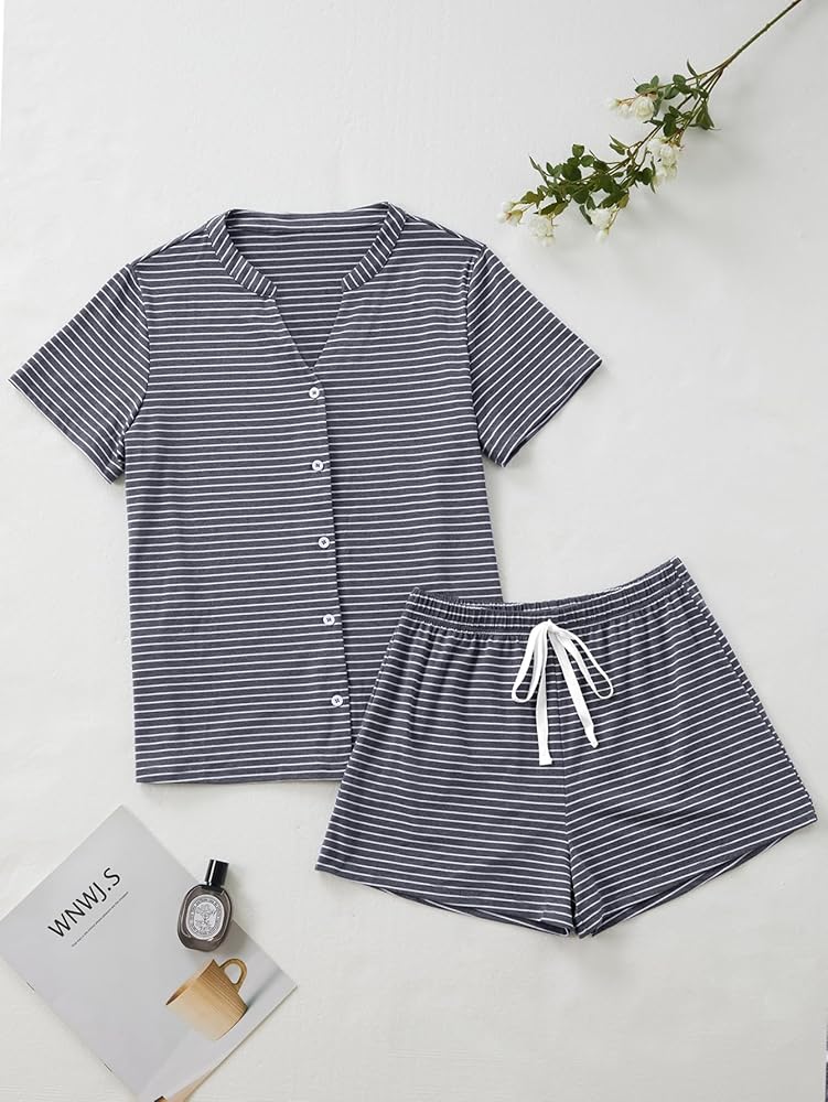 مجموعات شورت pjs برقبة على شكل حرف V، مخططة، أزرار لأعلى، مقاس عادي، قميص قصير الأكمام، وشورت خصر مرن، وهو طراز كلاسيكي، يمكن أن يجعلك تسترخي طوال اليوم.