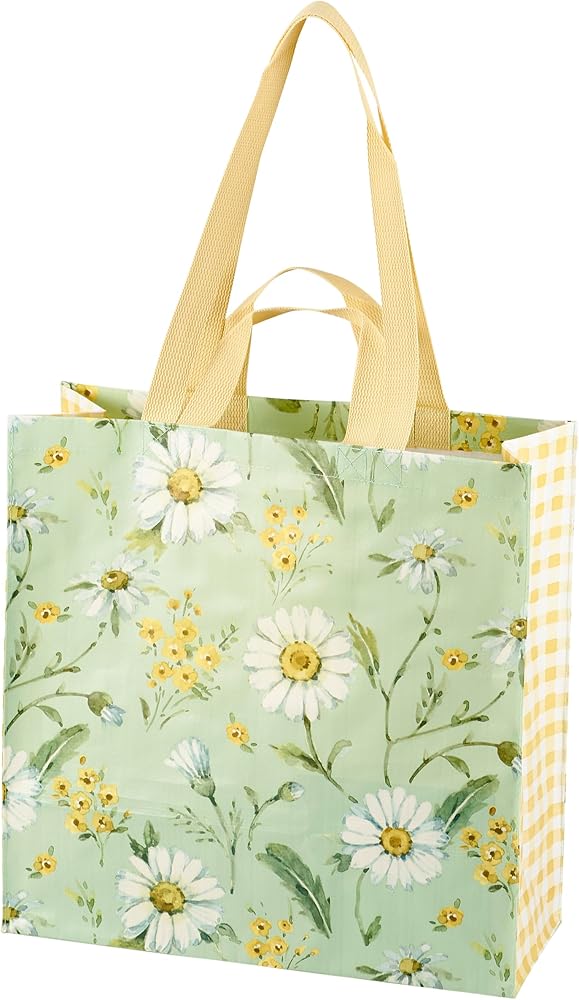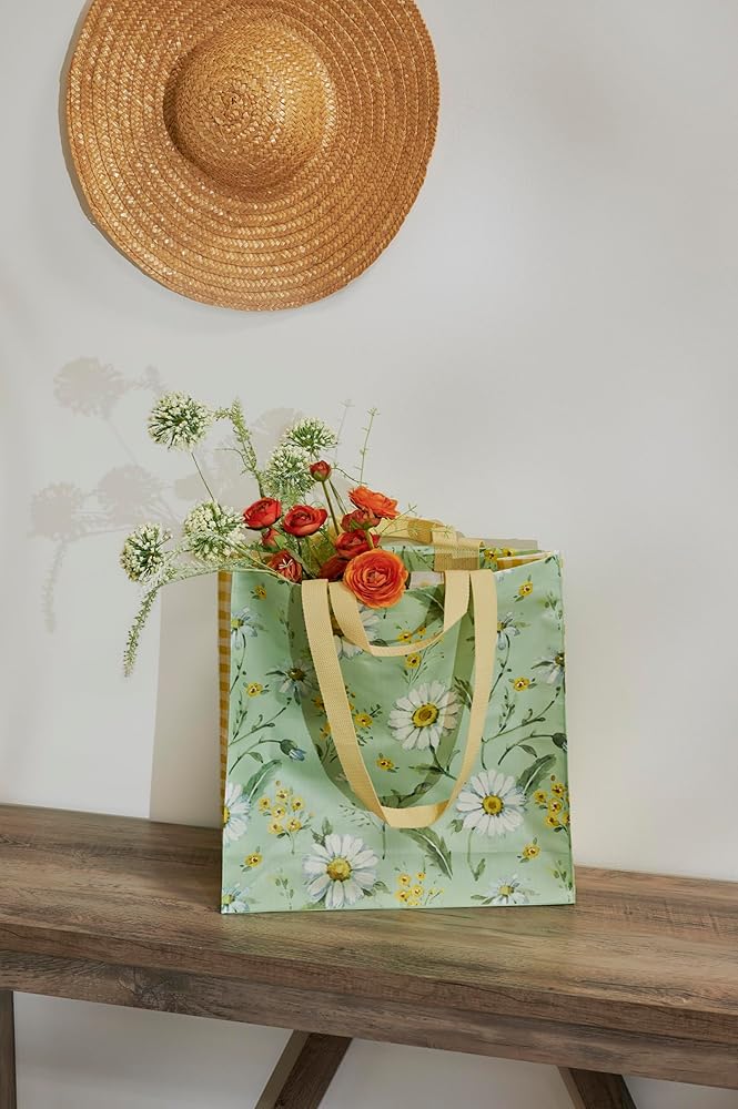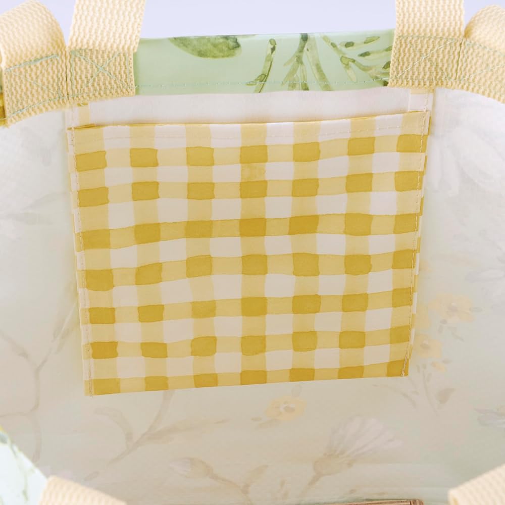 A double-sided market tote displaying an all-over design of daisies on a green background. Side gussets display coordinating yellow gingham pattern. Designs are replicated from original art hand painted in a delicate watercolor style. Market tote includes both hand and shoulder straps in yellow nylon and a convenient inside pocket with yellow gingham design. Our Green Daisy market tote is made from eco-friendly post-consumer material and folds flat for easy storage. A charming everyday accessory perfect for shopping or traveling.