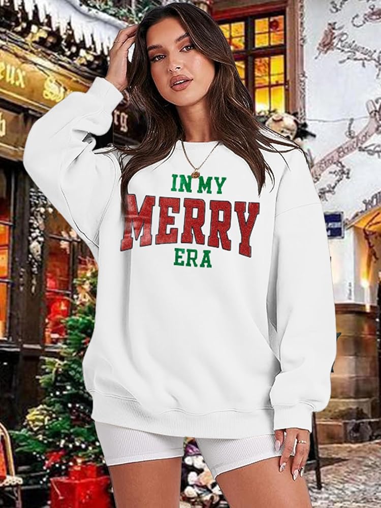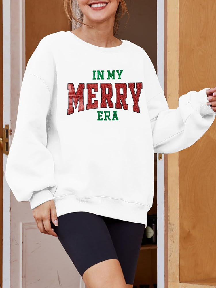 Product Description Material: Soft cotton blend and comfortable to wear Seasons: Autumn and winter Gender: Women Style: Fashion and causal Pattern Type: Letter graphic print Match: Easy to match with jeans, shorts, skirts, trousers, loafers and trainers Step into the festive spirit with our exclusive in my merry era sweatshirt, a perfect blend of ugly christmas charm and sophisticated ladies' fashion. Merry christmas sweatshirt is an indispensable fashion statement for your winter wardrobe, blending traditional christmas elements with a modern sense of style to make you stand out at festive parties. We are not only selling products, but also conveying an attitude towards life. We strictly select the fabric of sweatshirt, please be completely assured of our product quality. This christmas let's wear merry sweatshirts together and embrace joy and warmth in the name of fashion.