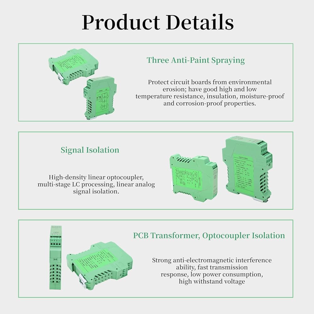 أداء عالي الجودة - يتميز مكيف الإشارة DC بمقاومة جيدة للبرد، وعزل ممتاز، ومقاومة للرطوبة، ومقاومة للتسرب، ومقاومة للاهتزاز، ومقاومة للشيخوخة. تُستخدم الطلاءات المقولبة لحماية لوحات الدوائر والمعدات ذات الصلة من التآكل البيئي.