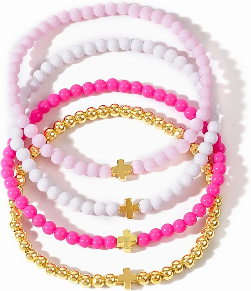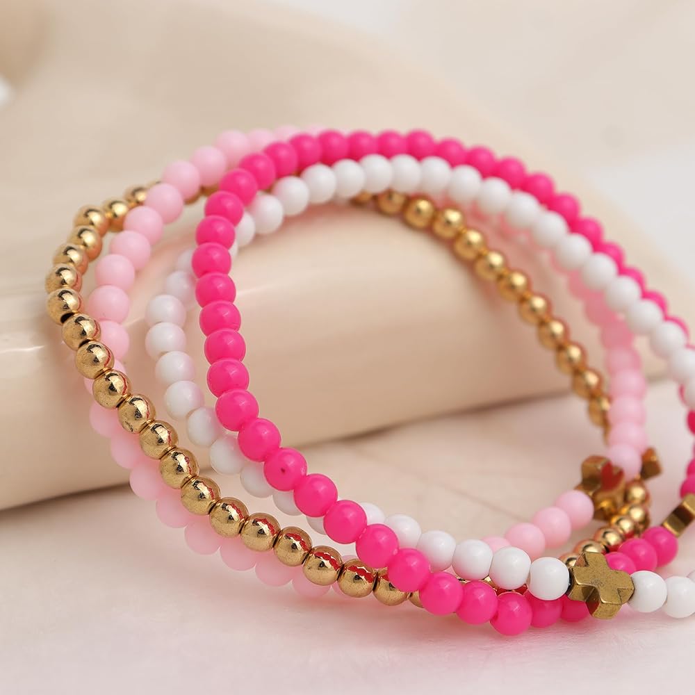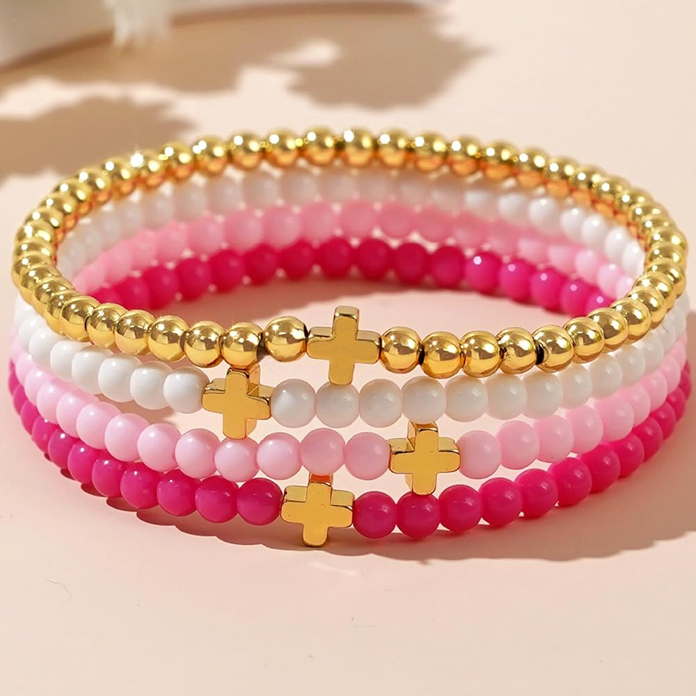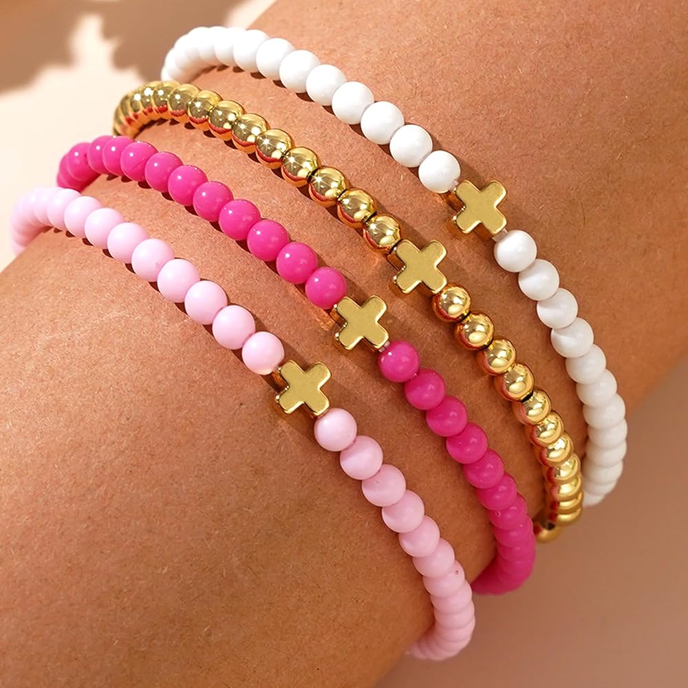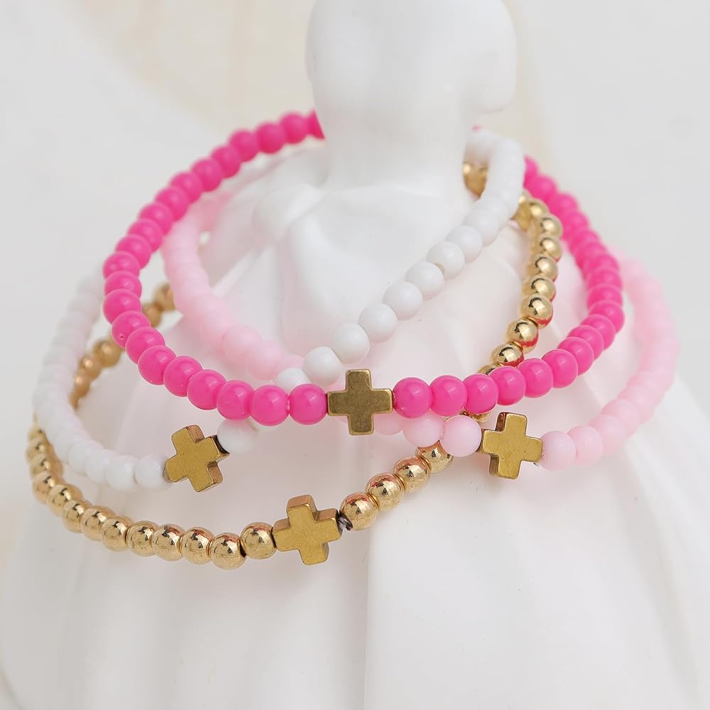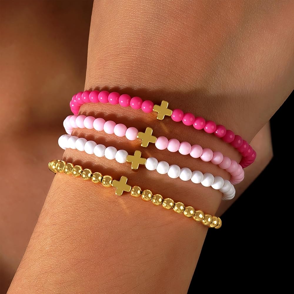 Trendy gold pink beaded cross stretch bracelet set, includes four bracelets, stretchable handmade beaded hand band, a stretch of gold pink beads ball string, with dainty gold cross, a great accessory for this spring and summer.