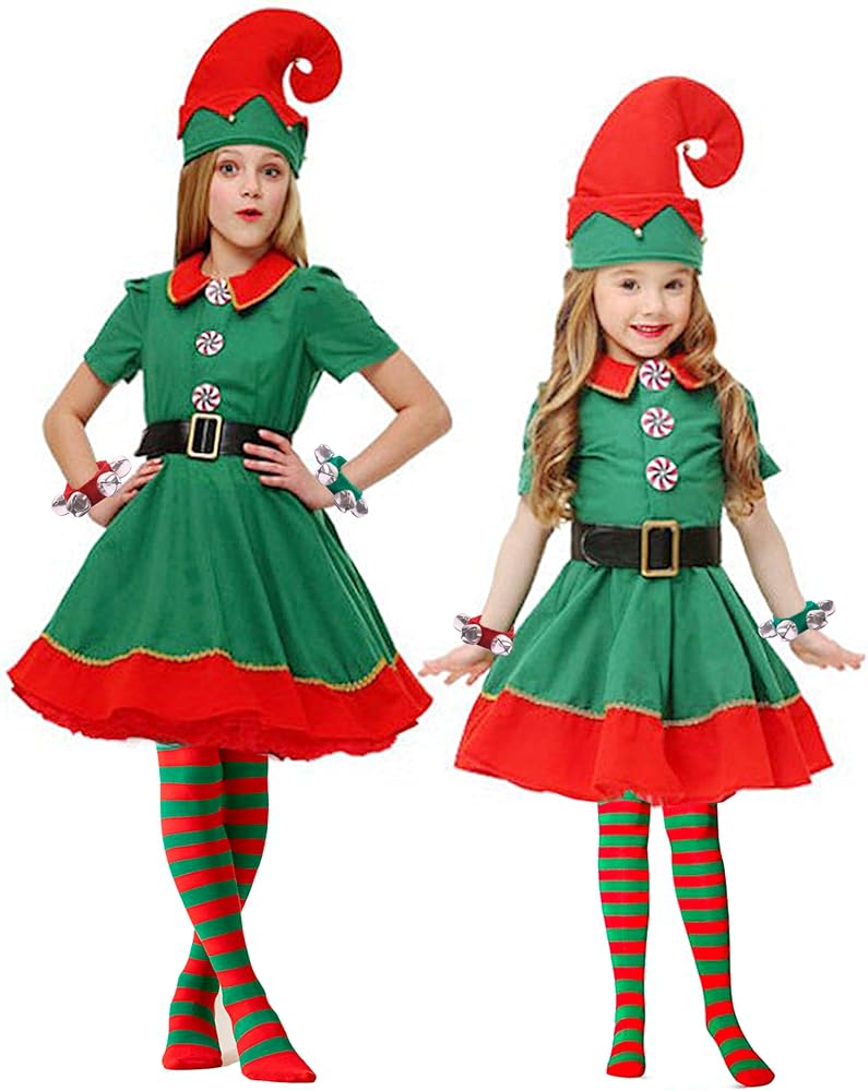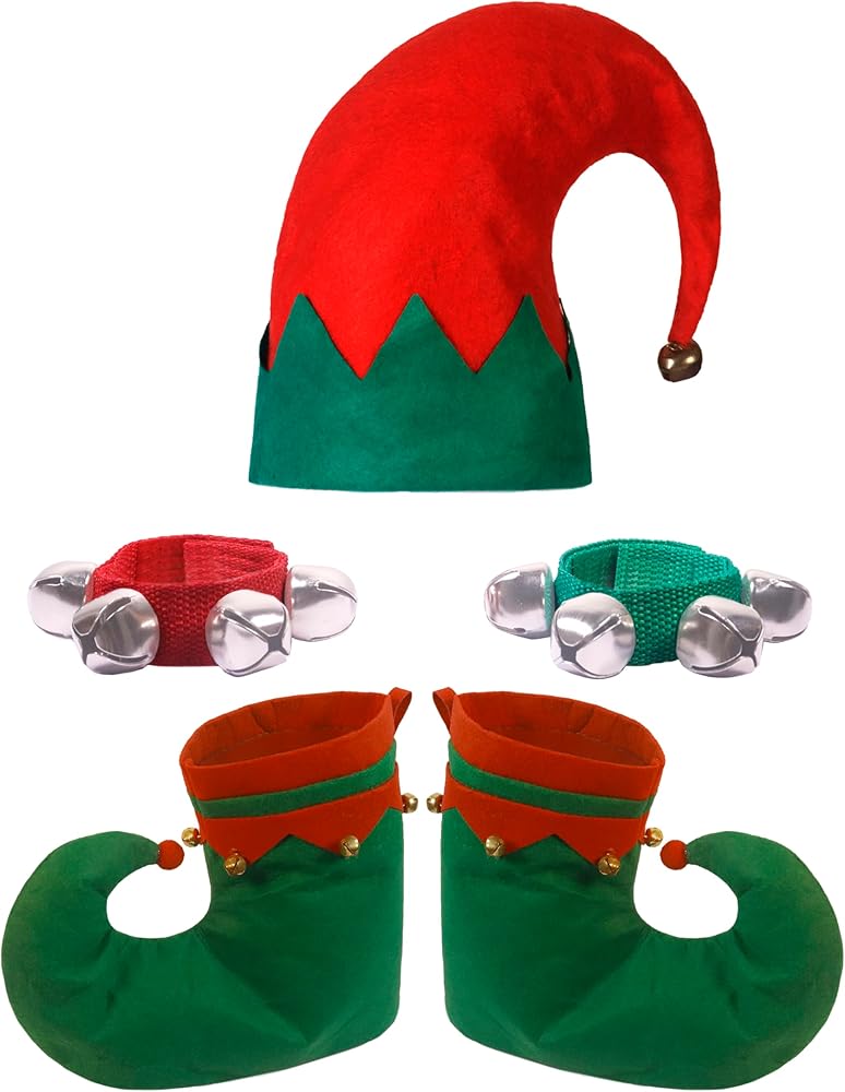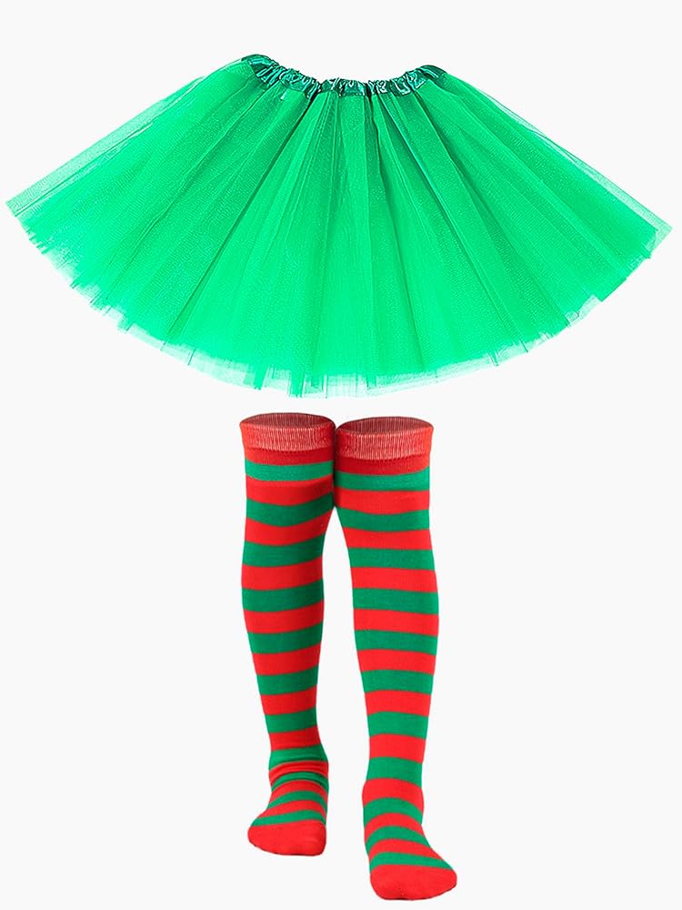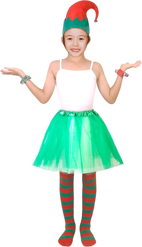 مجموعة مكونة من 5 قطع: تتضمن تنورة توتو، وقبعة قزم، وجوارب مخططة، وأحذية قزم، وأجراس معصم للحصول على مظهر قزم عيد الميلاد المثالي.