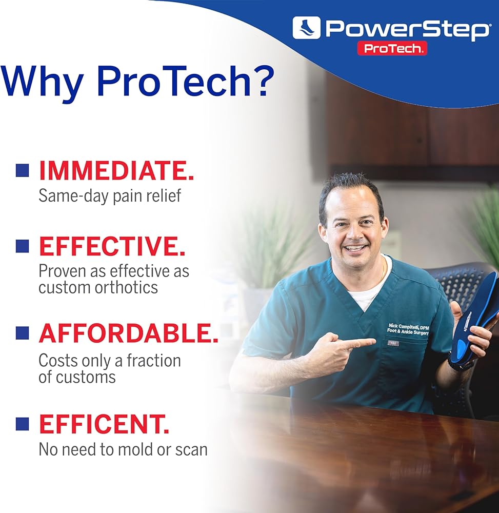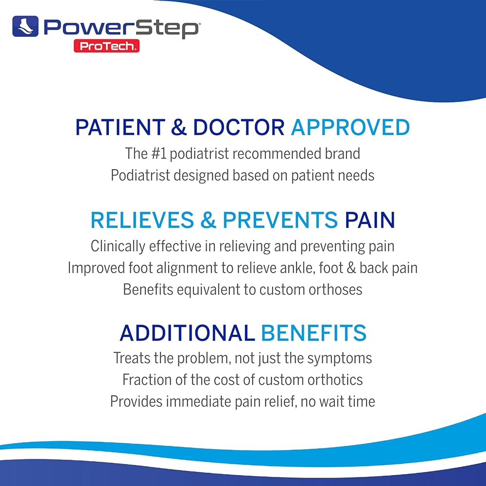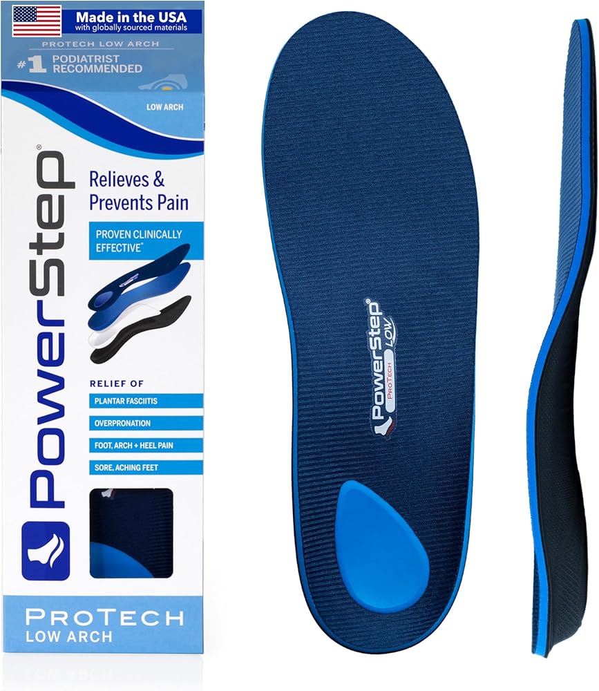 PowerStep ProTech orthotic inserts are designed with built-in low arch support, heel cradle, and a perfect balance of support and comfort. These orthotics help alleviate discomfort caused by foot conditions like plantar fasciitis, heel spurs, arch pain, and overpronation.