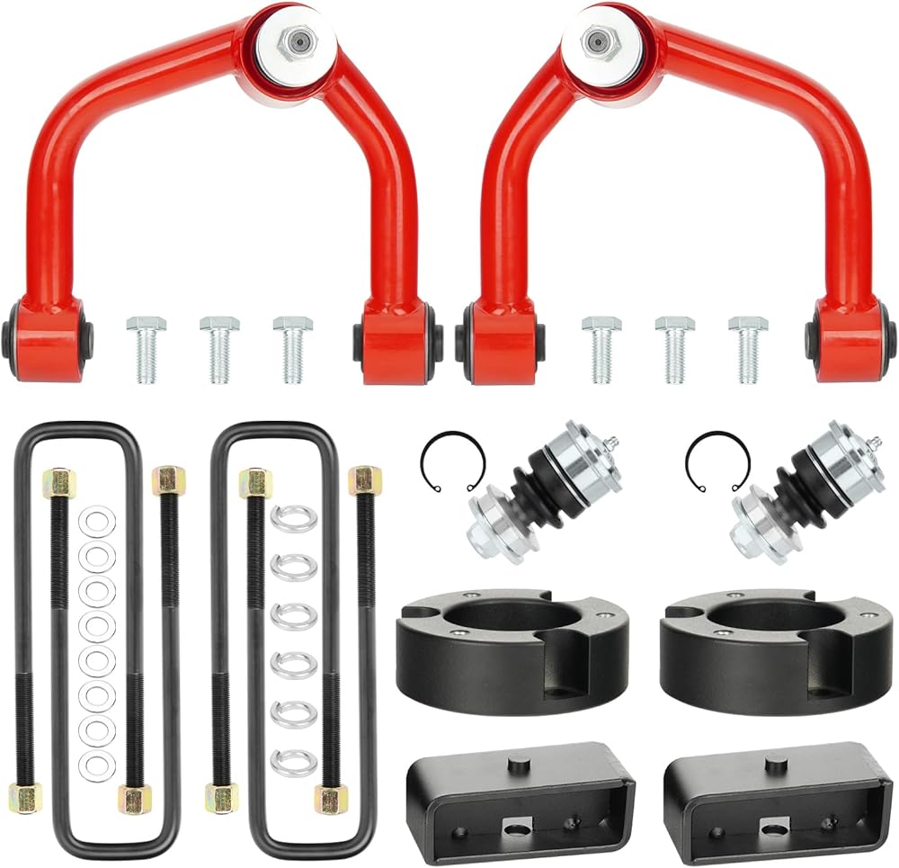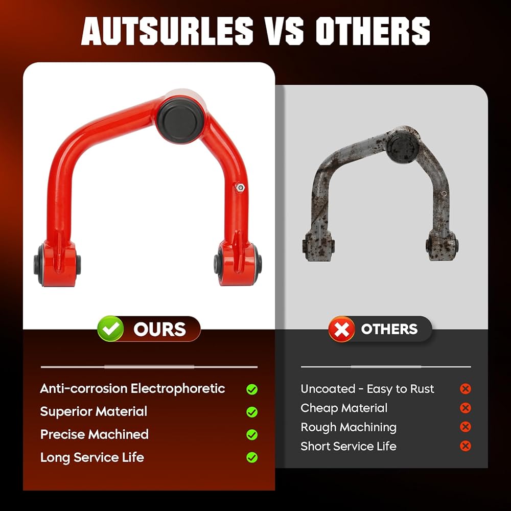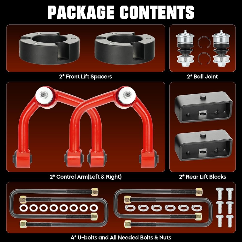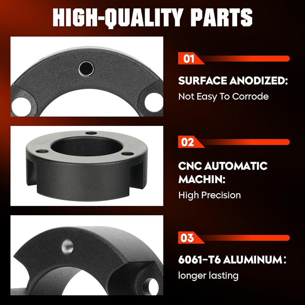 【Anti-Corrosion & Durable】:The leveling kit is made of 6061-T6 aluminum alloy and 12.9 grade solid bolts, CNC automatic processing for better durability. The Control arm kit is made of steel and wrought iron, and the surface is treated with electrophoresis for corrosion protection.
