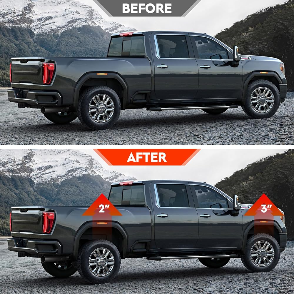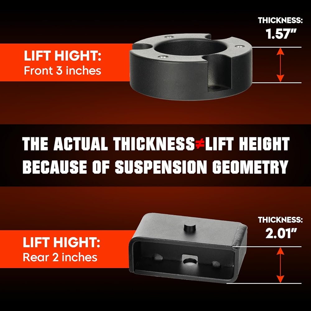 【Note】:The leveling lift kit will raise your vehicle 3 inch in the Front, 2 inch in the Rear. The control arm adjustable height is 2-4 inches. Due to suspension geometry, the ratio between lift height and kit thickness is not 1:1. An alignment is always recommended after installing,to guarantee proper handling and tire wear.