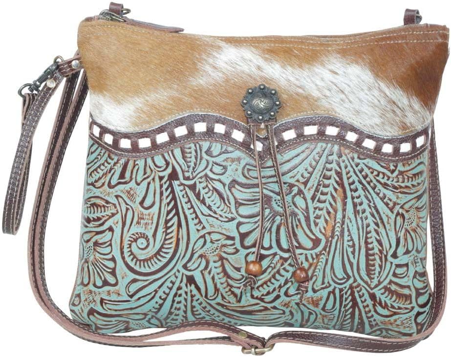 Experience the luxurious blend of style and functionality with the Blue Isle Cowhide Crossbody Purse by Myra Bags. This stunning cowhide purse scores a perfect 100 on style and durability. The brown and white cowhide, coupled with turquoise floral tooled leather, makes this hair-on-hide purse a visual treat. Its design is inspired by western aesthetics, making it a perfect accessory for women who love western-style purses. The purse is also an ideal choice for those seeking cute bags for women with a unique twist.