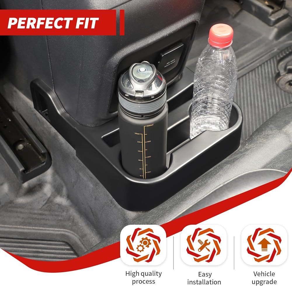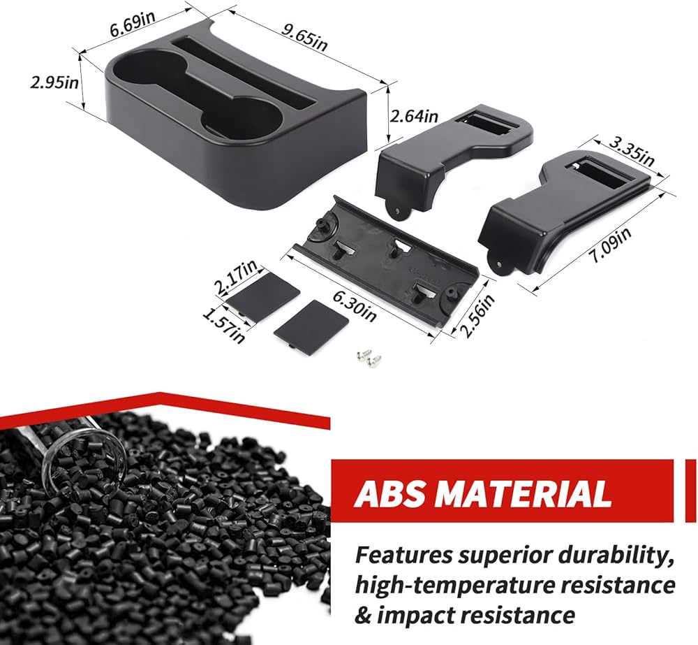Solid ABS Construction. This backseat cup holder is made of injection-molded ABS that comes directly from the factory center console for an exact fit. The cup holder fits perfectly around the rear console to maximize the storage and keep your items organized.