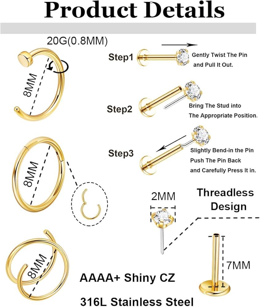 مادة عالية الجودة: حلقة الأنف هذه مصنوعة من الفولاذ المقاوم للصدأ سعة 316L، ومسامير الأنف مدمجة في زركون لامع. سطح حلقة الأنف أملس، ولون التلميع العالي جيد جدًا. حلقة الأنف هذه لا تسبب الحساسية ومناسبة للبشرة التي تعاني من الحساسية