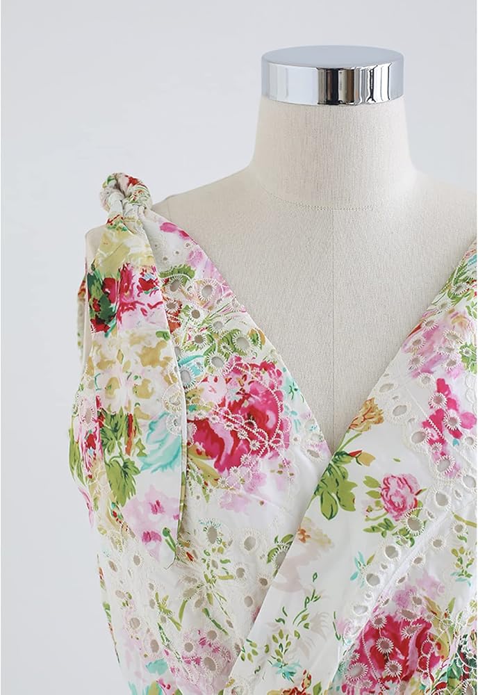 [تفاصيل المنتج] - حاشية قصيرة - تصميم ملفوف من الأمام والخلف - زهرة مطرزة وغطاء للثقوب - أشرطة ذاتية الربط على الأكتاف - خصر مرن - مبطن - 100% بوليستر - يُغسل يدويًا بماء بارد