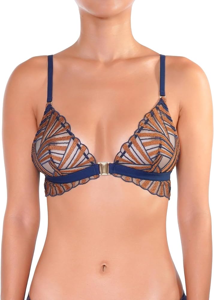 Introducing our latest lingerie masterpiece: the Etincelle Bralette. Elevate your style with this charming new addition. A harmonious blend of vintage-inspired glamour and modern allure. This bralette is adorned with intricate Art Deco lace, creating a striking visual statement that captures the essence of a bygone era. Designed without underwire for ultimate comfort, it provides gentle support and all-day ease. Front closing clasp for easy on/off. Stretch elastic waistband for comfort and all day support. Customize the fit with adjustable shoulder straps for your perfect, confident look. Elevate your confidence and embrace the perfect combination of comfort and sophistication with this exquisite undergarment. Revamp your lingerie collection with the Etincelle bralette, where charming playfulness meets unparalleled comfort and versatility.