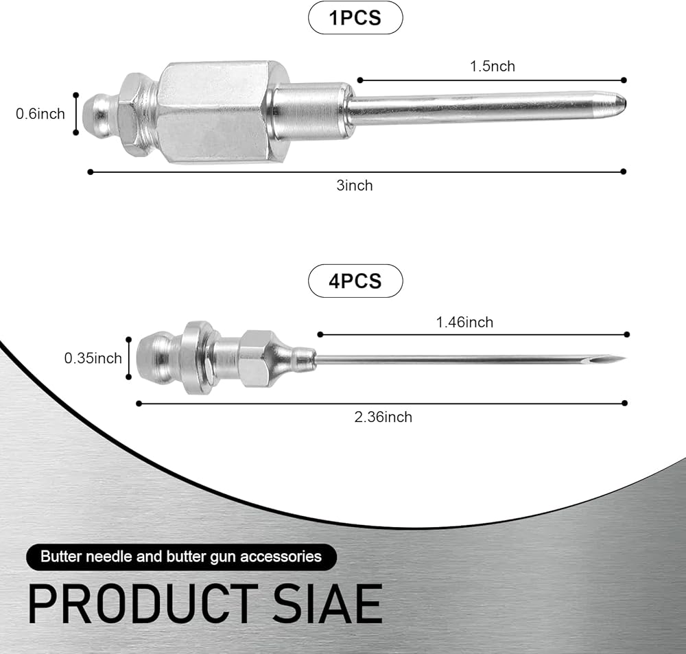 Package Content: You will receive 4 grease needle nozzles with a size of 6cm/2.36" x 0.9cm/0.35", and 1 grease needle dispenser with a size of 7.6cm/3.0" x 1.5cm/0.6", which is enough to meet your daily use and replacement needs.