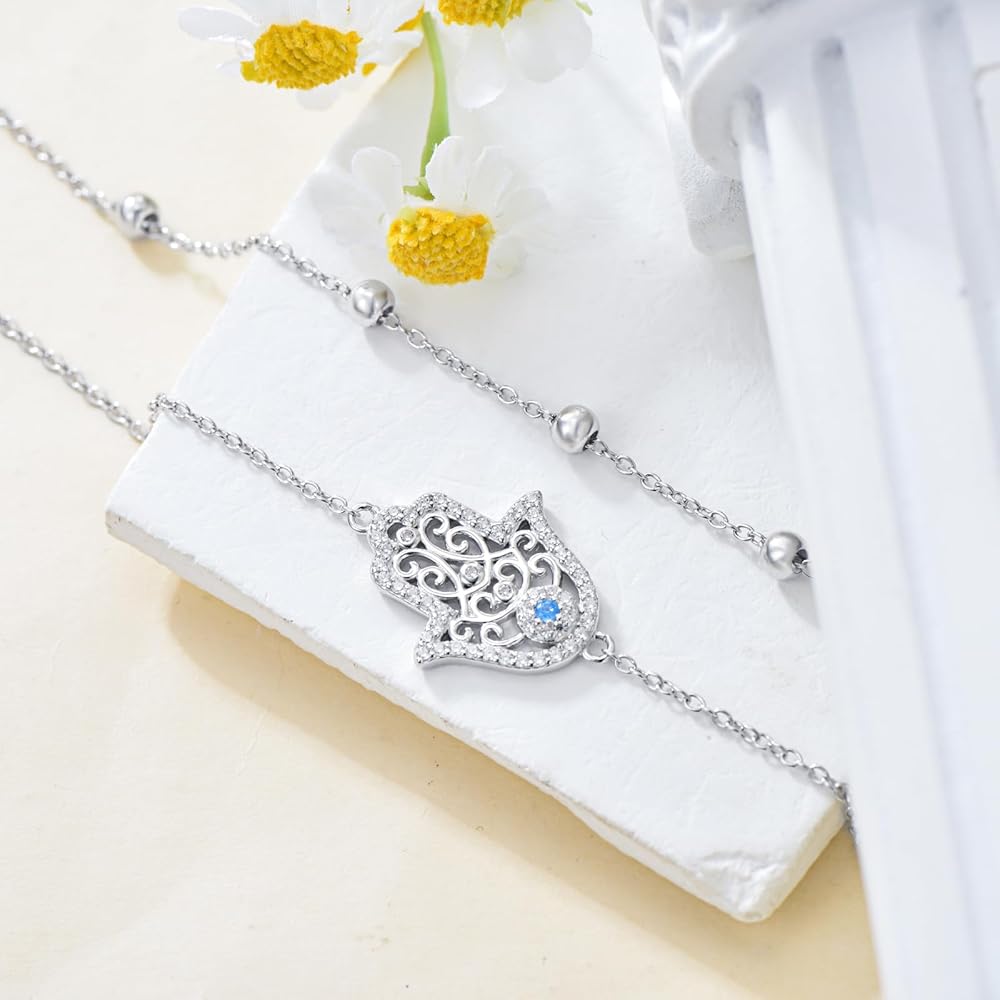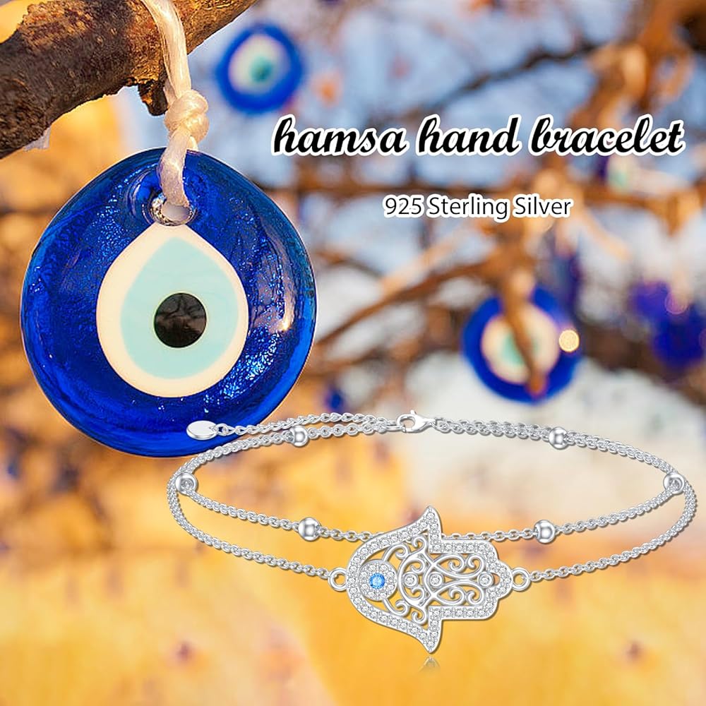 URONE Hamsa Hand Bracelet 925 Sterling Silver Hand of Fatima Evil Eye Bracelet Hamsa Jewelry Gift for Women