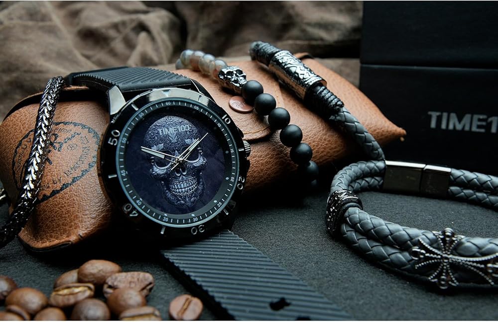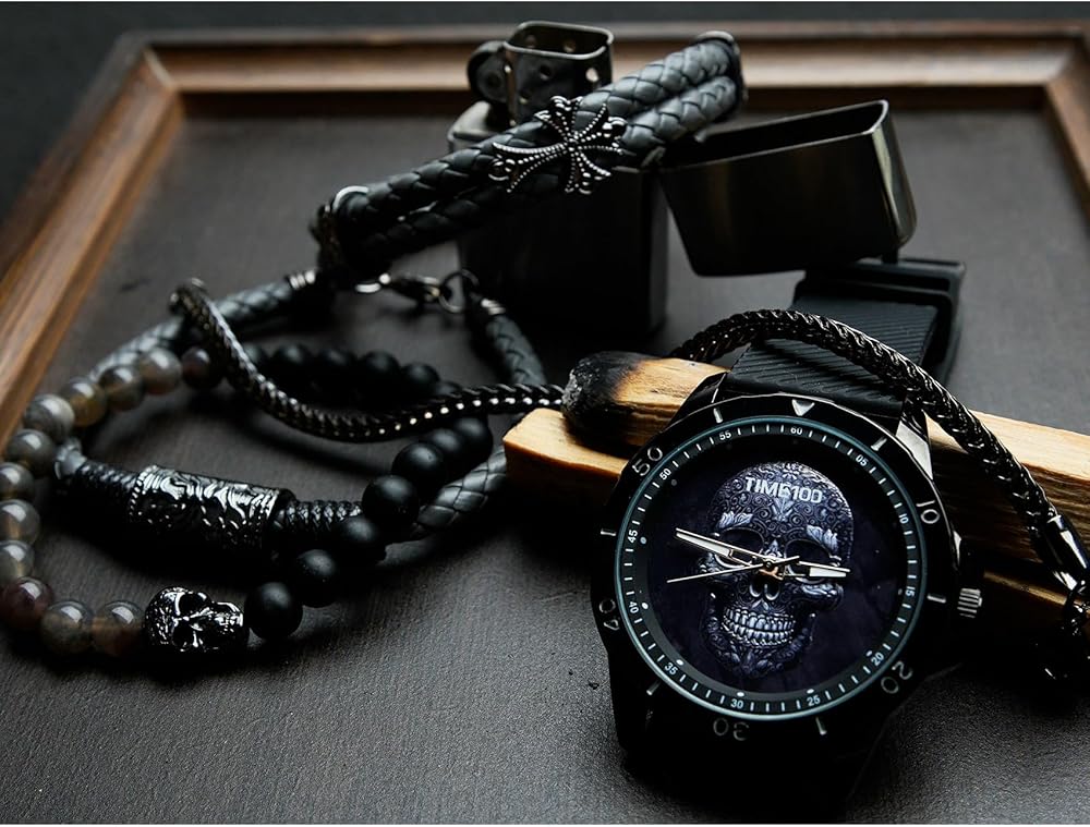 • تصميم جمجمة جريئة: تتميز هذه الساعة بزخارف جمجمة سوداء مذهلة على وجه الساعة، مما ينضح بجمال جريء وجريء