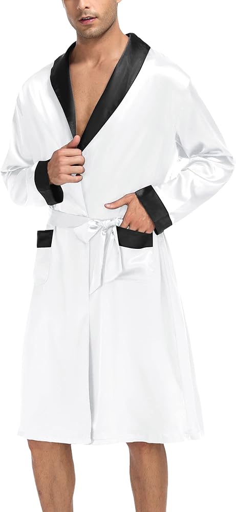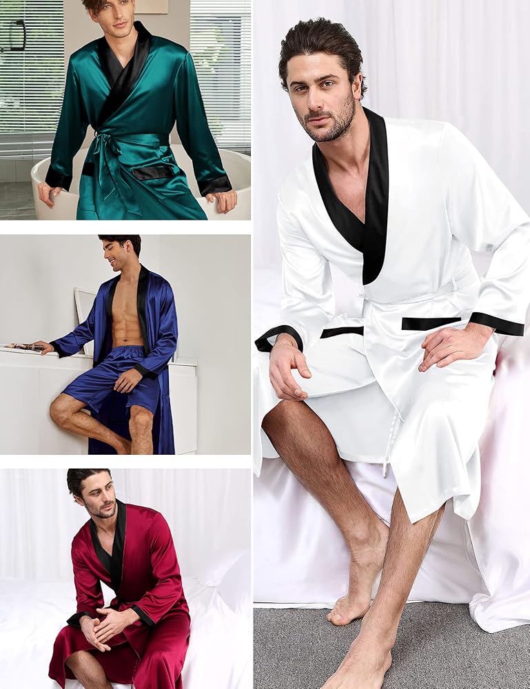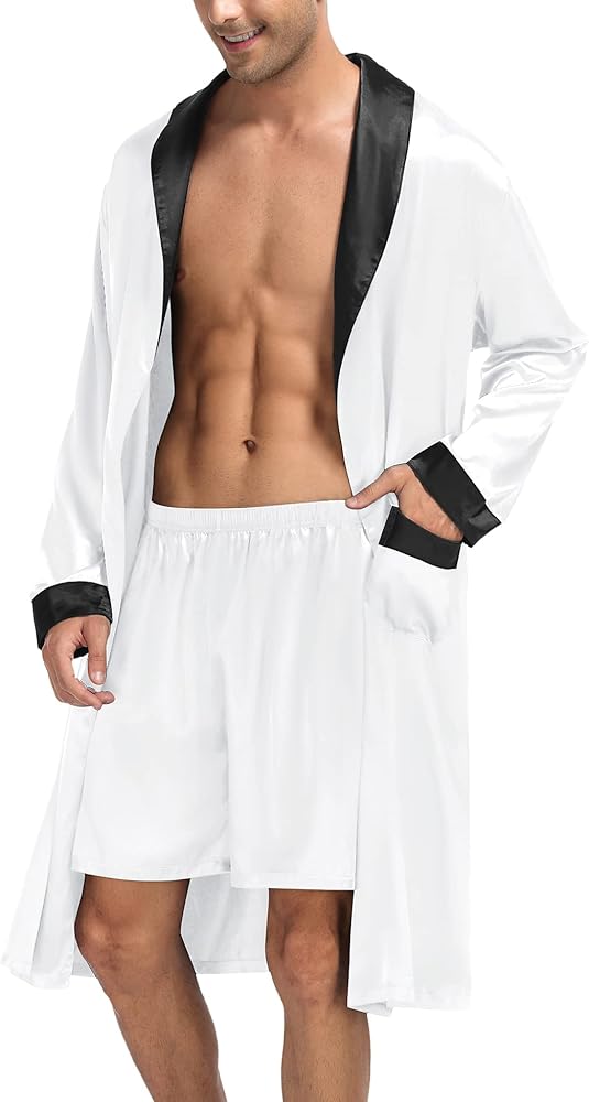 المناسبات: رداء الساتان المصمم بشكل جميل مع مجموعة السراويل القصيرة مثالي للاستحمام، والاستحمام، وملابس الاسترخاء، وحمام السباحة، والفندق، والعطلات، والحفلات، وحفلات الزفاف، والساونا، والمنتجعات الصحية، وحوض الاستحمام الساخن، وصالة الألعاب الرياضية، ووقت الفراغ. هذا الرداء خفيف الوزن مثالي طوال اليوم. يمكن لمجموعة الرداء الرجالي هذه أن تلبي احتياجاتك طوال العام