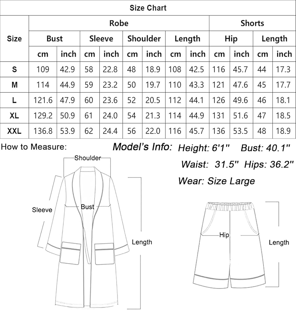 المزايا: طقم رداء حمام كومونو للرجال مع شورت يتضمن رداء بطول الركبة وأكمام طويلة مع جيبين أماميين، وحزام قابل للتعديل/للإزالة وأربطة داخلية؛ شورت بخصر مطاطي ناعم، يمكن ارتداؤه وخلعه بسهولة