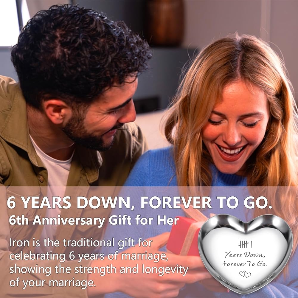 • 6 Year Anniversary Gifts for Her/Him: This 6th anniversary gift for her jewelry dish is printed with "6 years down, forever to go", it's strong and durable, just like your 6 years of marriage. Iron is the traditional gift for celebrating 6 years of marriage, showing the strength and longevity of your marriage. Perfect 6 year anniversary gift ideas for couples. 6th anniversary gifts for wife, 6th anniversary iron gifts, iron anniversary gifts for her/him