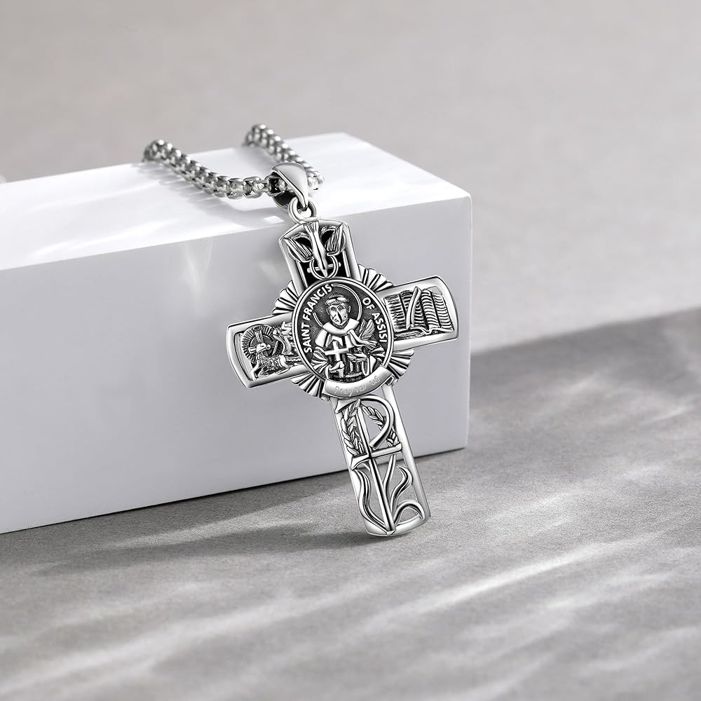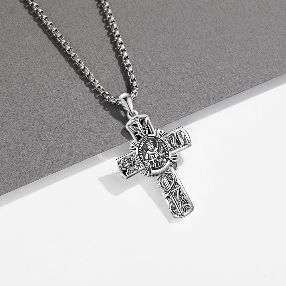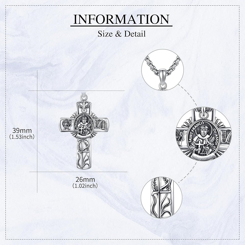 🕆قلادة متقاطعة: 39*26 ملم (1.53*1.02 بوصة). طول سلسلة رولو من الفولاذ المقاوم للصدأ: 22 بوصة + 2 بوصة موسع. قلادة القديس فرانسيس قابلة للإزالة من السلسلة. العبوة: 1* قلادة من الفضة الإسترلينية، 1* قطعة قماش تلميع، 1* صندوق هدايا رائع.