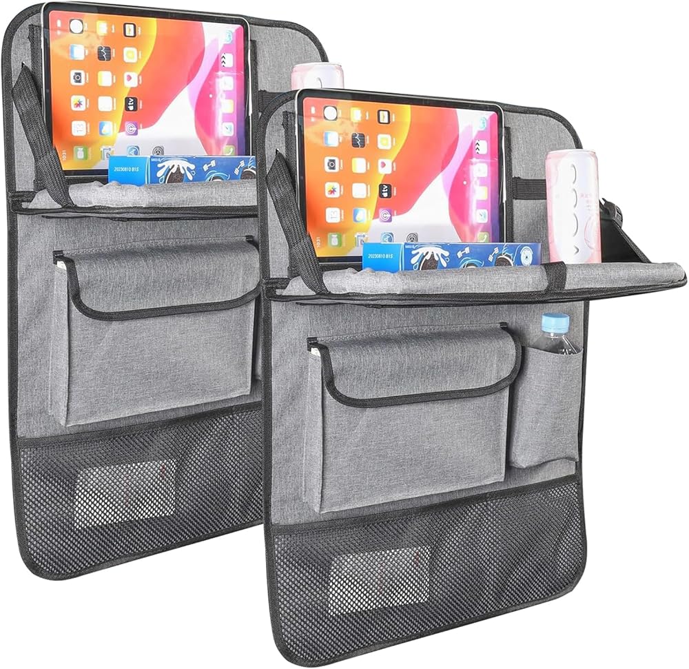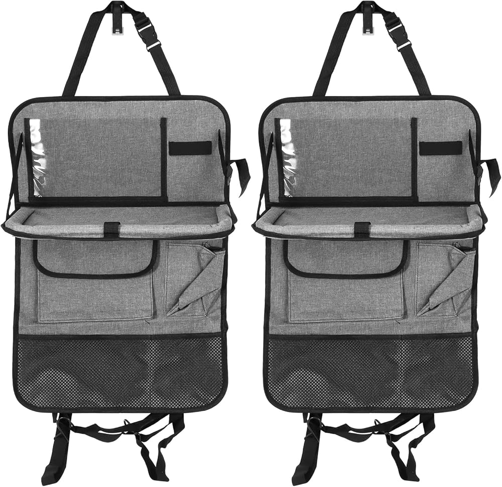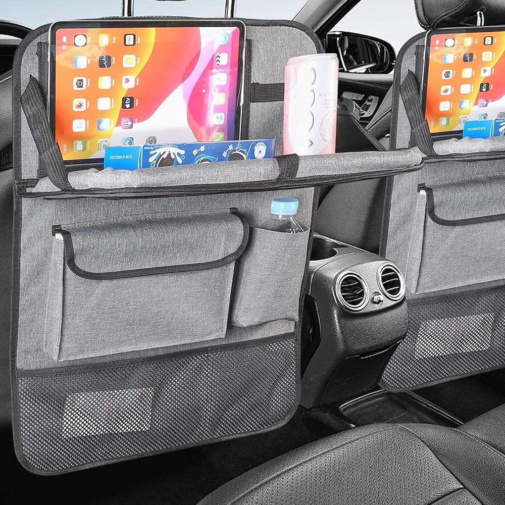 منظم المقعد الخلفي للسيارة مع حامل للكمبيوتر اللوحي - عبوتان منظم المقعد الخلفي للسيارة مع صينية طاولة قابلة للطي، منظم تخزين السيارة مع صينية طعام قابلة للطي، واقي المقعد الخلفي للأطفال (رمادي)