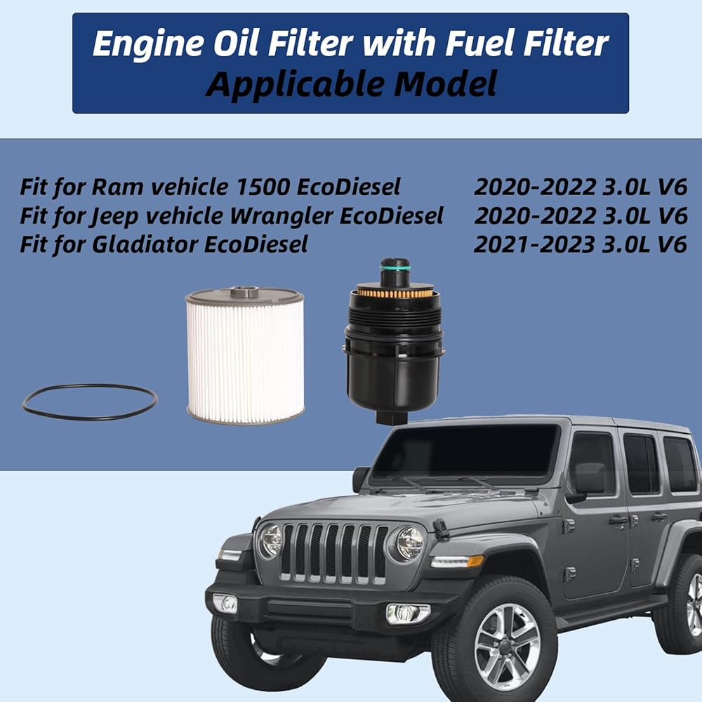 - 【نموذج قابل للتطبيق】مجموعة فلتر زيت المحرك هذه مناسبة لسيارة رام لـ 1500 EcoDiesel 3.0L V6 2020-2022 | مناسب لسيارة جيب لسيارة Wrangler EcoDiesel 3.0L V62020-2022، لسيارة Gladiator EcoDiesel 3.0L V6 2021-2023.