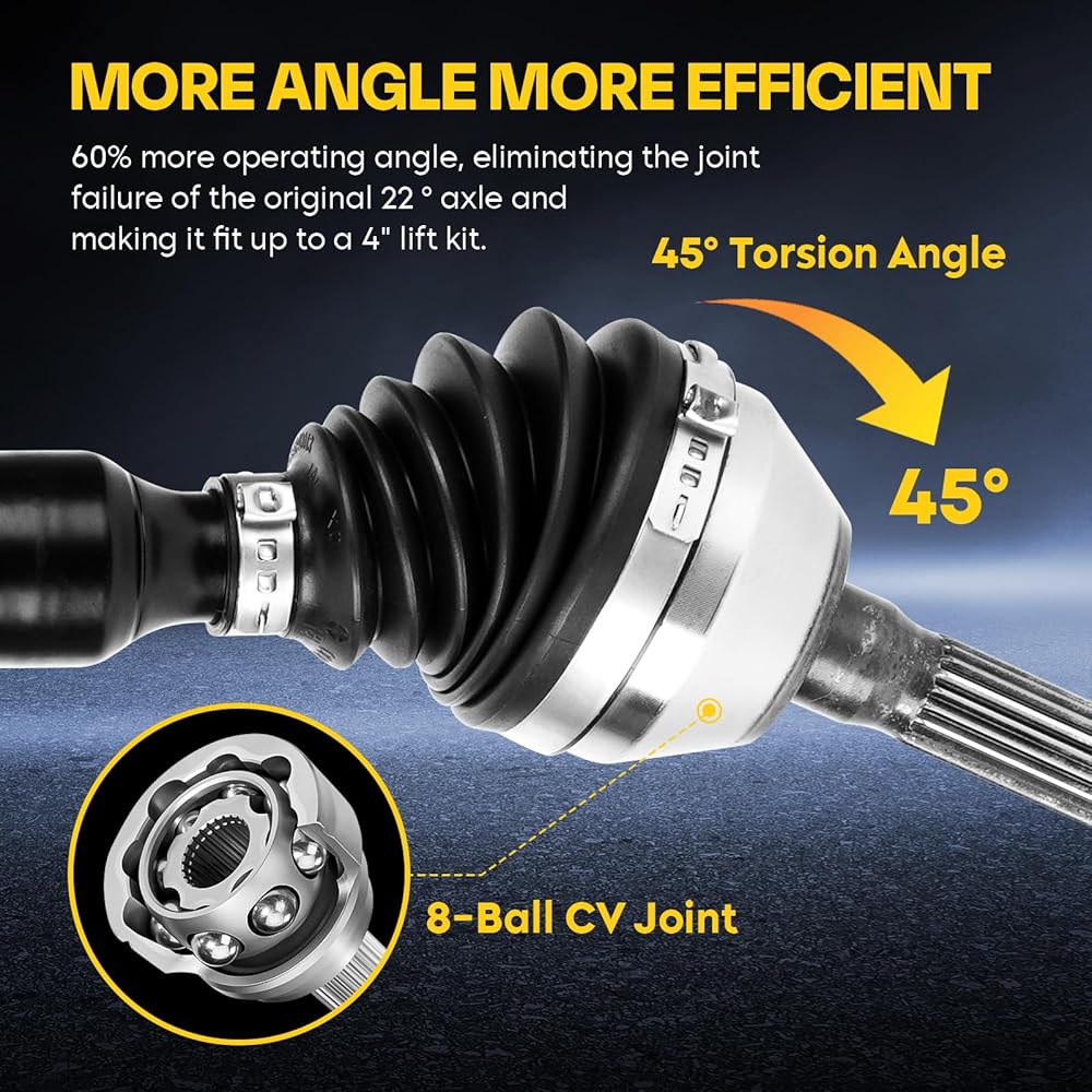 • 📐45° Operating Angle: 8-Ball inner & outer joint, 60% more operating angle, eliminating the joint failure of the original 22 ° axle and making it fit up to a 4" lift kit, increasing ride height and safety.