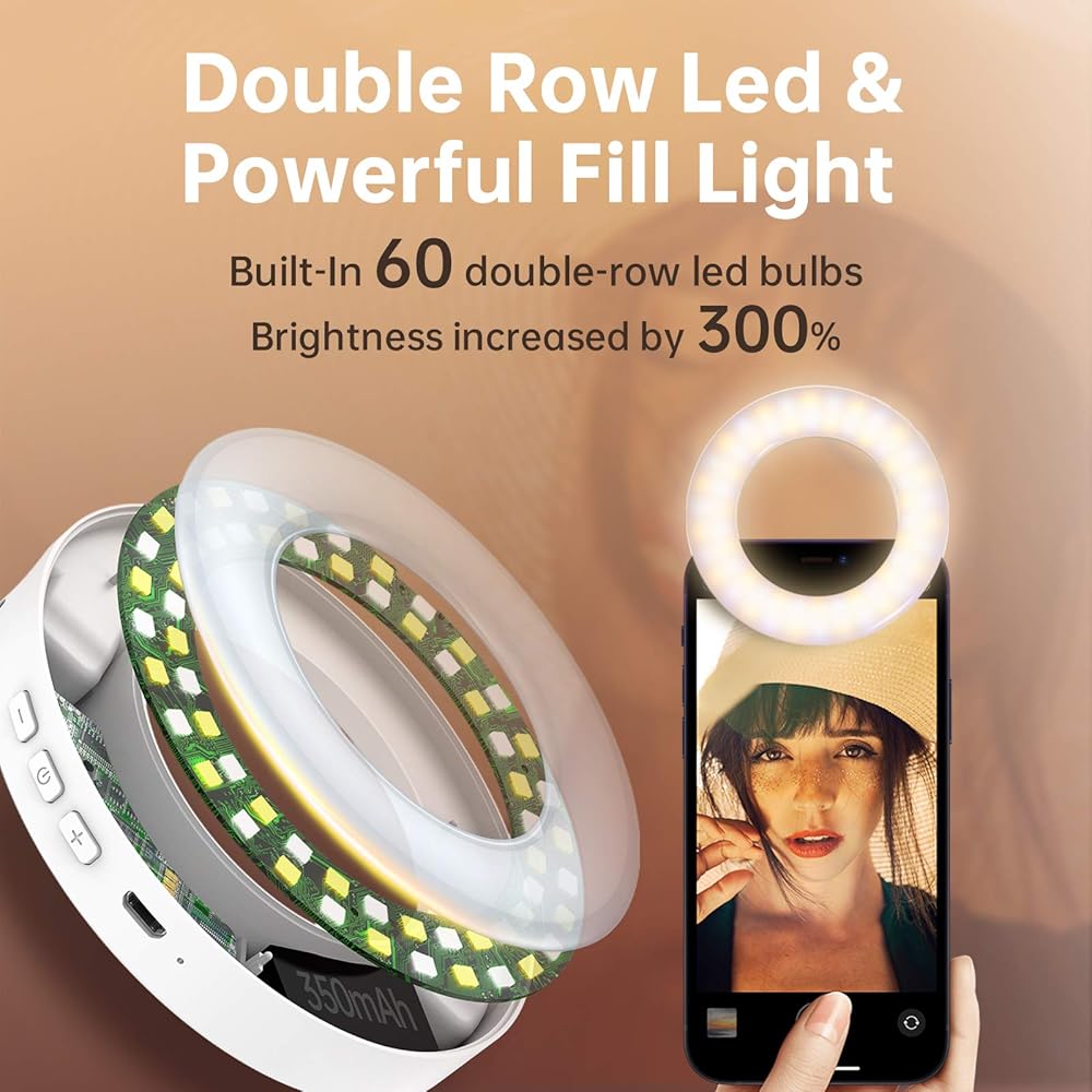 🍑【زيادة السطوع بنسبة 300%】مصباح LED مدمج بـ 60 صفًا مزدوجًا، هذا الضوء الدائري القوي يجعل خطوط وجهك أكثر تجسيمًا ويجعل تفاصيل المنتج أكثر وضوحًا. سجل صورًا ومقاطع فيديو عالية الجودة لكل لحظة مهمة في حياتك!