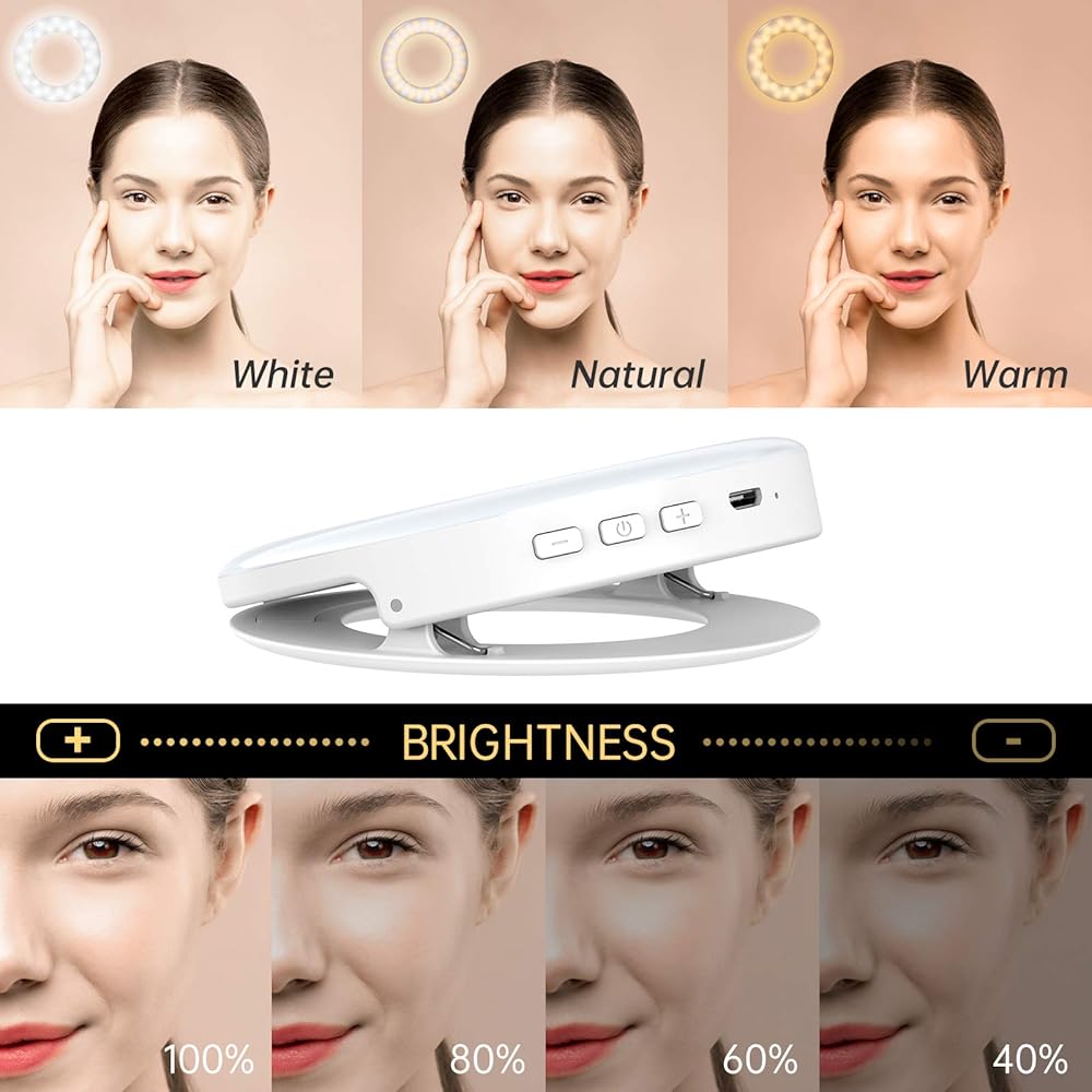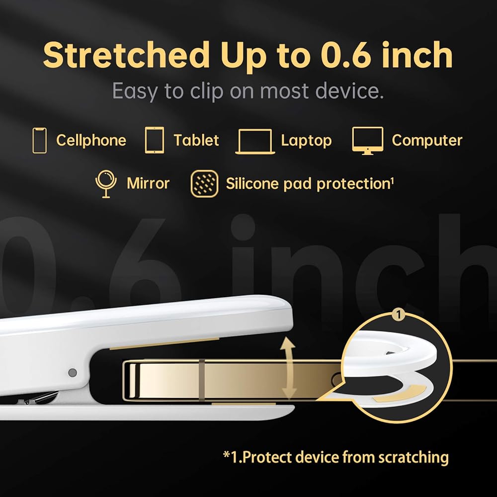 🍑【إضاءة حلقية خافتة مع 3 أوضاع إضاءة】يمكنك بسهولة تبديل سطوع 4 مستويات و3 أوضاع إضاءة للضوء الدافئ والضوء الأبيض والضوء الطبيعي، ومناسبة لاستخداماتك المتعددة في ظروف مختلفة. طالما أن سمك جهازك أقل من 0.6 بوصة، يمكنك بسهولة تثبيت الضوء، مثل الهاتف الخلوي أو iPad أو الكمبيوتر المحمول.