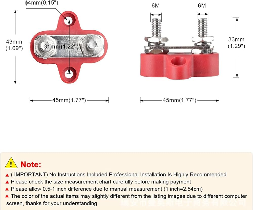 Package Contents --- Package contains 1 x M6 Black Heavy Duty Binding Pole (1/4 inch), 1 x M6 Red Binding Pole (1/4 inch); 4 x Mounting Screws Fixed installation with surface screw, two installation holes, easy to install in any direction.