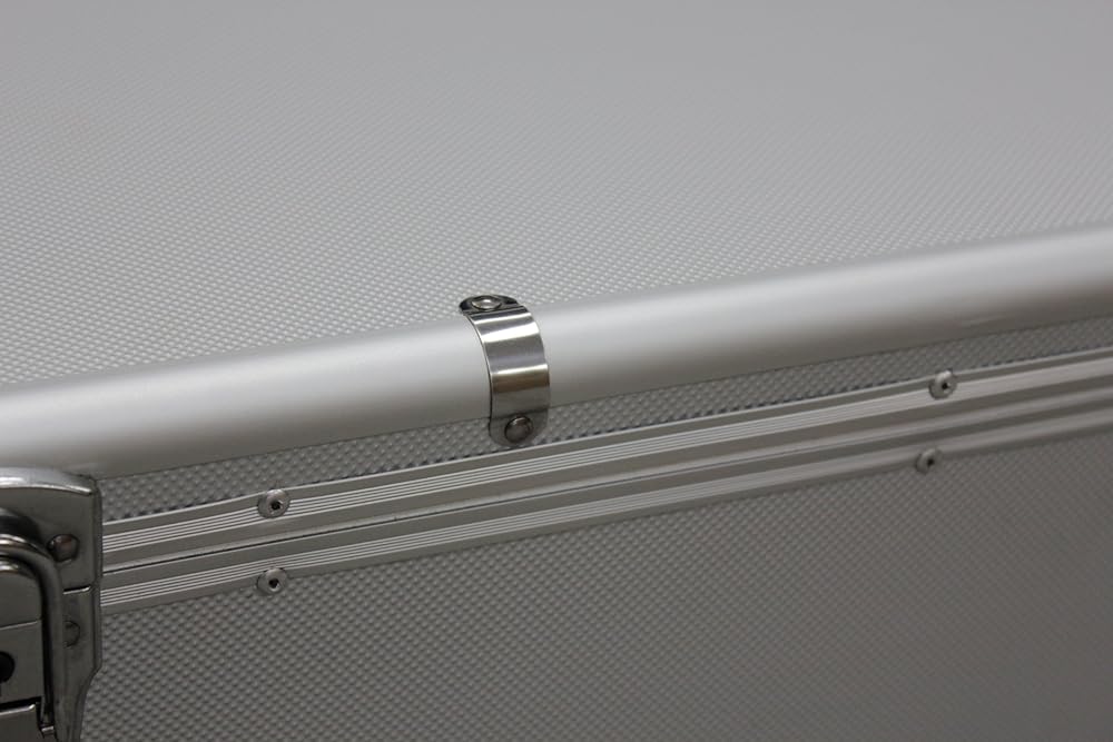 Quarter round shape strong Aluminum construct, 2 hinges,2 chrome lock, 2 spring controlled chrome solid metal handle installed at both side of the case.