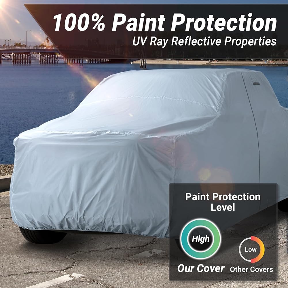 حماية مقاومة للماء بنسبة 100%: غطاء السيارة iCarCover's مناسب لجميع الأحوال الجوية مصنوع من مواد مقاومة للماء بنسبة 100%، مما يوفر حماية فائقة ضد المطر والثلج والبرد والشمس الشديدة. يتميز بحماية كاملة من الأشعة فوق البنفسجية، فهو يساعد على الحفاظ على طلاء سيارتك ولمسة نهائية لسنوات. تمنع البطانة الداخلية المصنوعة من القطن الناعم الخدوش، بينما يحمي الغطاء سيارتك من العوامل الخارجية القاسية.