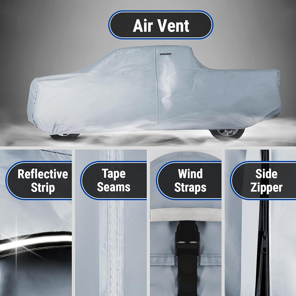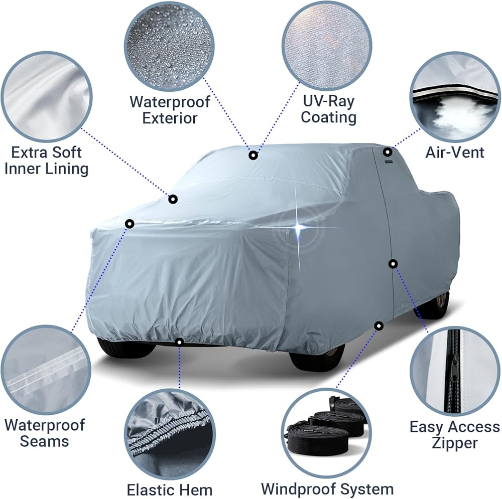 ميزات متقدمة لحماية فائقة: تم تصميم الغطاء الخاص بنا من أجل المتانة، ويتميز بطبقات مبطنة مقاومة للماء لمنع أي تسرب، بالإضافة إلى التهوية التي تسمح بتدفق الهواء وتقليل تراكم الرطوبة، مما يحافظ على جفاف سيارتك. مادة GSM عالية الجودة متعددة الطبقات مقطوعة آليًا ومضغوطة للحصول على القوة القصوى وحماية طويلة الأمد، بغض النظر عن ظروف الطقس.