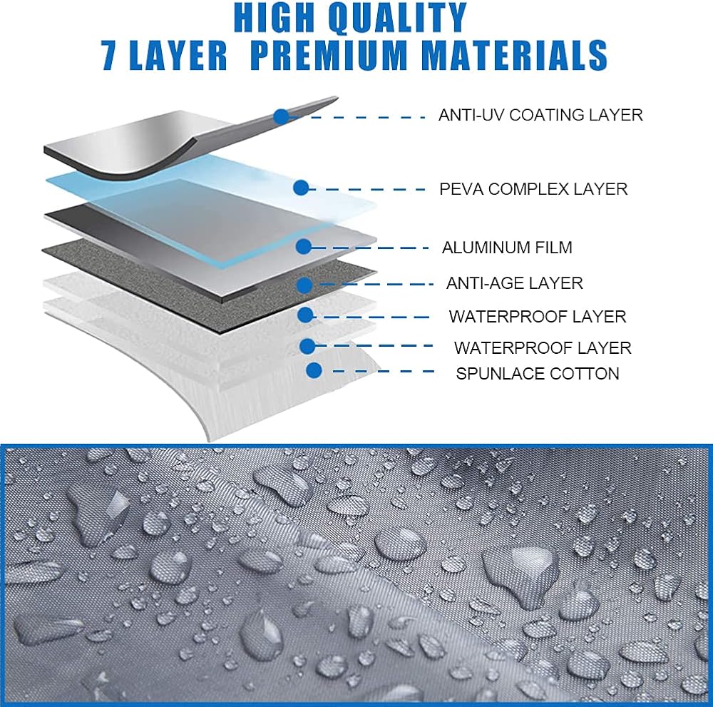 متين ومقاوم للخدش - هذا الغطاء المقاوم للماء من رانجلر مصنوع من 7 طبقات مذهلة من المواد - ① طبقة طلاء مضادة للأشعة فوق البنفسجية، ② طبقة مضادة للشيخوخة، ③-④ طبقتان مقاومتان للماء ⑤ طبقة معقدة من مادة PEVA، ⑥ طبقة ألومنيوم و⑦ طبقة من الدانتيل المغزول القطني الناعم. إنه جيد التهوية، وواقي، وناعم من الداخل، لذلك لا داعي للقلق بشأن احتجاز الرطوبة أو خدوش طلاء السيارة.